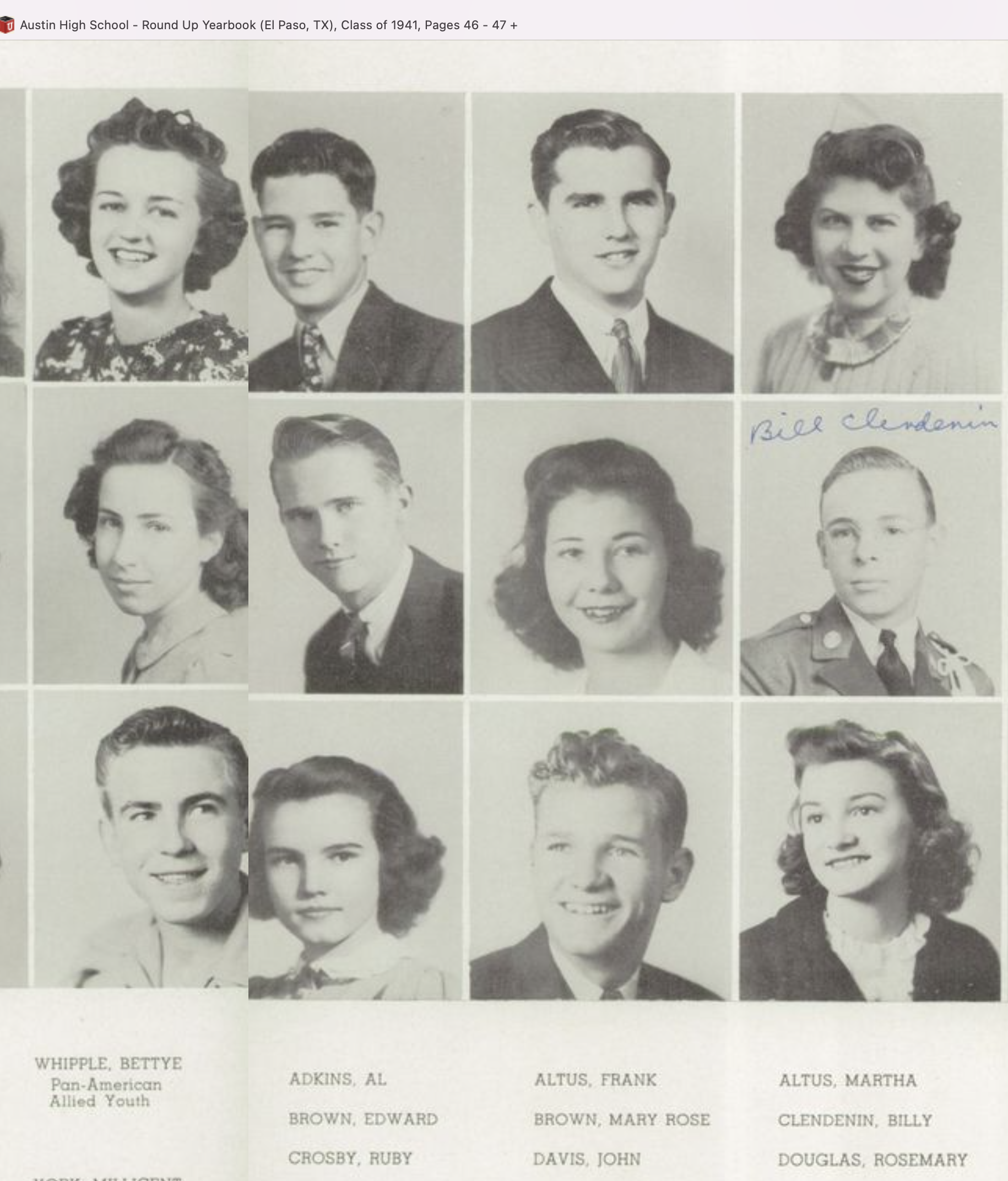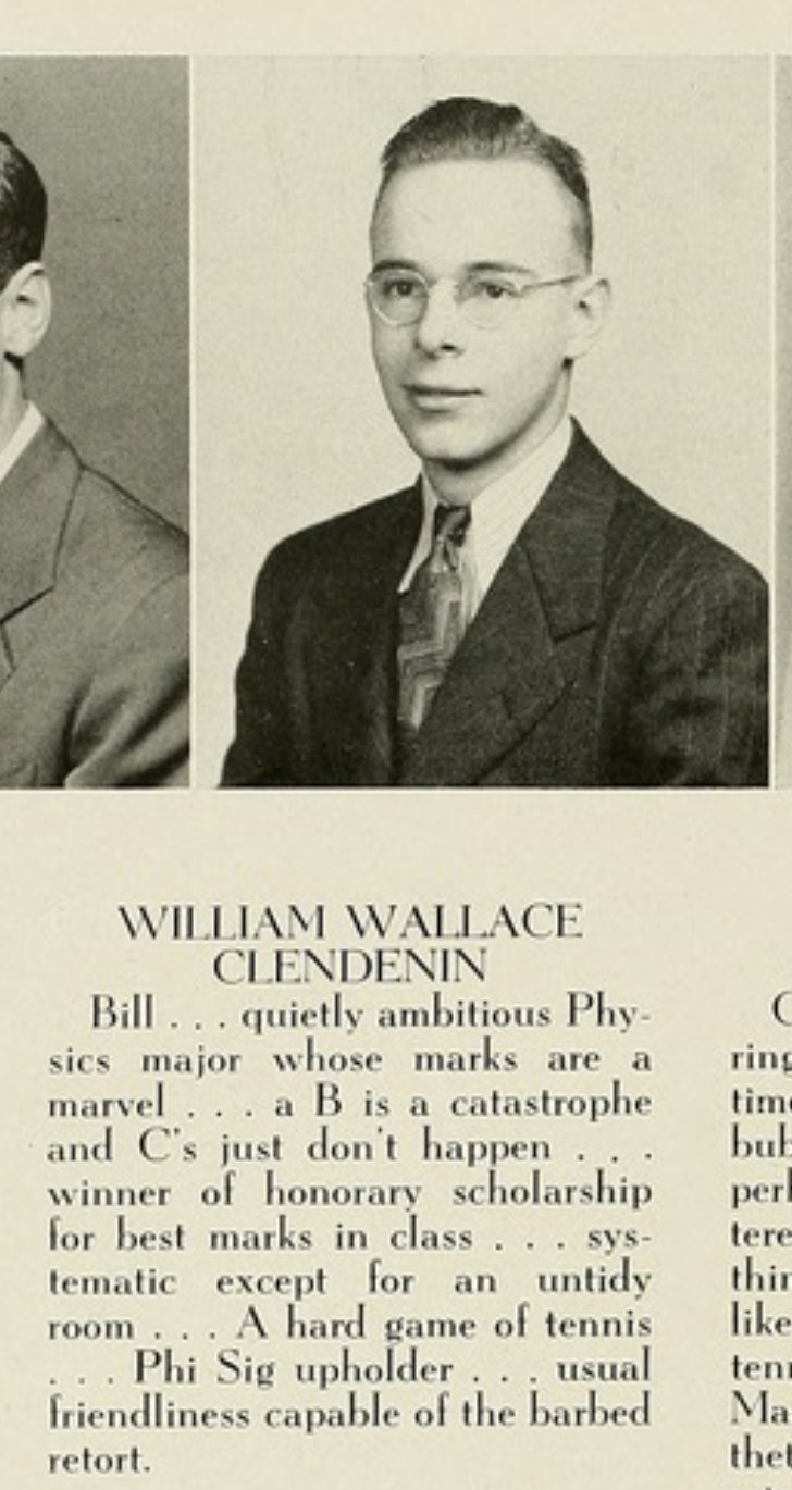 William Wallace Clendenin was born January 17, 1926, to Mr. and Mrs. Thomas Pipes and Maybelle Baumann Clendenin in Mount Vernon, NY.. He was reared in El Paso, Texas and was graduated from Austin High Schoo in 194l. He received a bachelor of arts degree from Swarthmore College and a master's degree in in physics from Yale University. He received his PhD from Yale in 1952. He was a member of Phi Beta Kappa. He served in the U. S. Signal Corps and held the rank o ffirst lieutenant in the reserve. His siblings Alice (Mrs. R. M. Thomson) , Thomas Michael and John Livingston. Alice and John also attended Swarthmore College. Michael was a graduate of Columbia University and was Phi Beta Kappa like William. At the time of the wedding Alice was living in Syracuse, NY.
