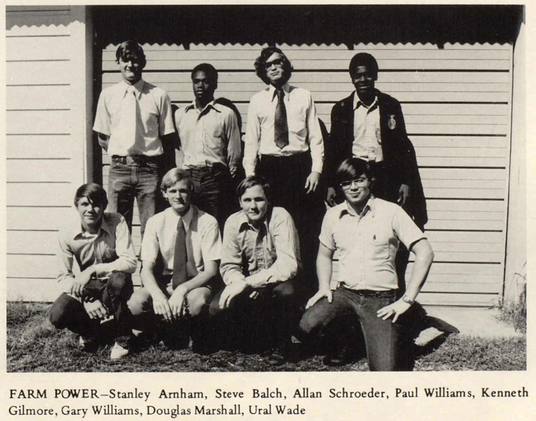 Front Row: Stanley Arnham, Allan Schroeder, Kenneth Gilmore, Douglas Marshall Back Row: Steve Balch, Paul Williams, Gary Williams, Ural Wade, Farm Class, Elgin High School, 1974 |