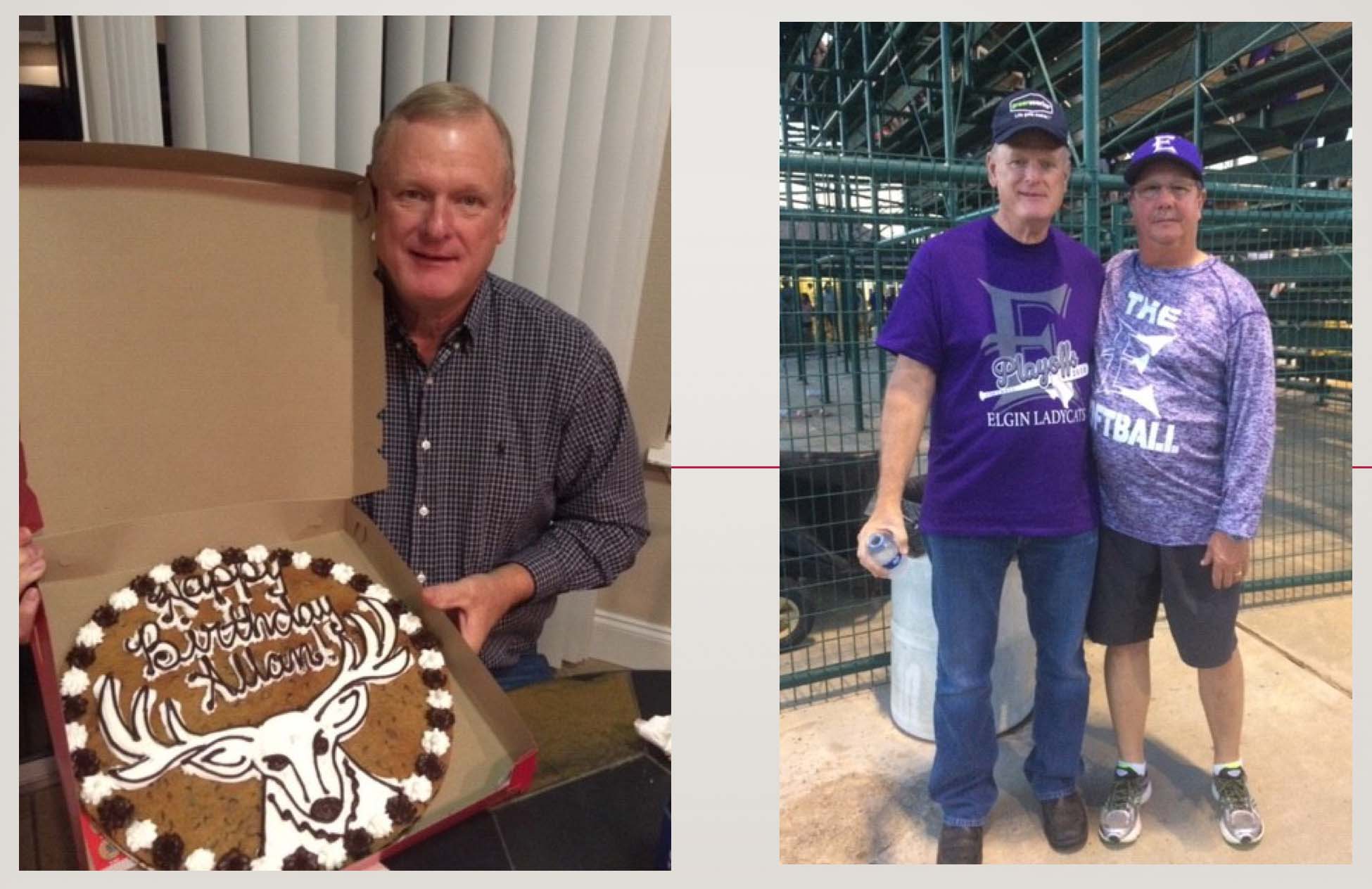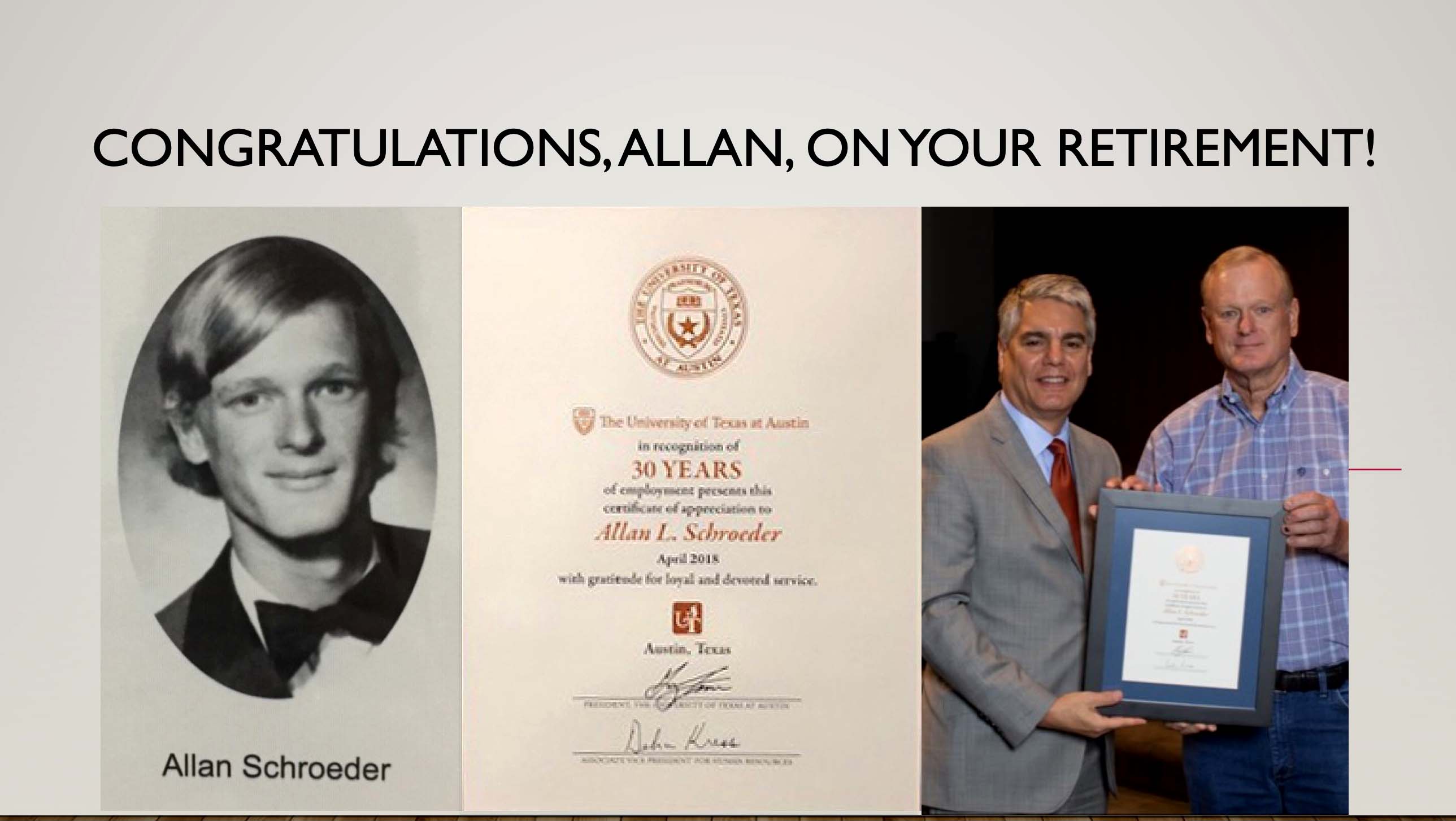 At left, Allan Schroeder, Elgin High School, 1974 At right, Allan Schroeder and President Gregory L. Fenvres, recognizing Allan's 30 years of service to UT, April 2018. |