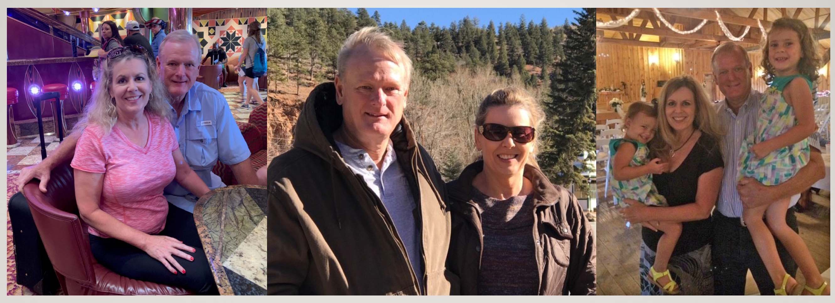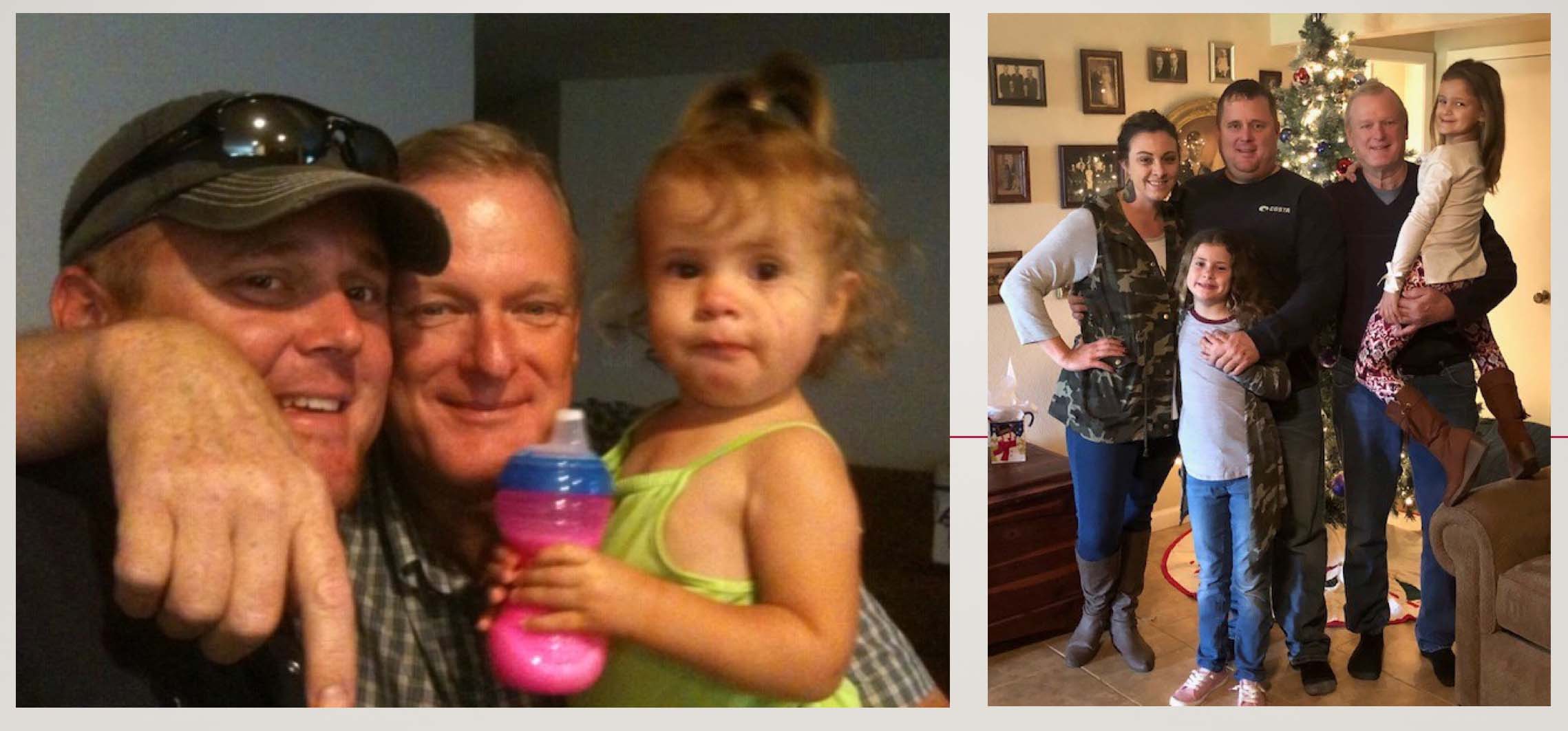 Left: James, Allan and Kinsey Schroeder; at right, Natalie, Kinsey, James, Allan and Maelie Christmas 2018 |