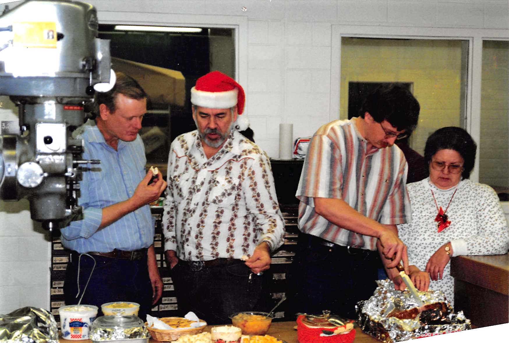 At left: Allan Schroeder, Billy Kilgore, Danny Boyd, Marynell Gamboa, Shop Christmas Party |