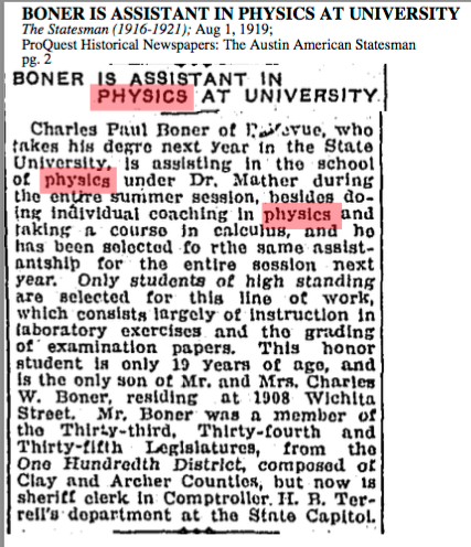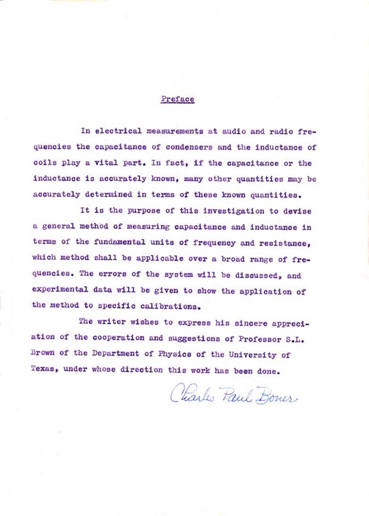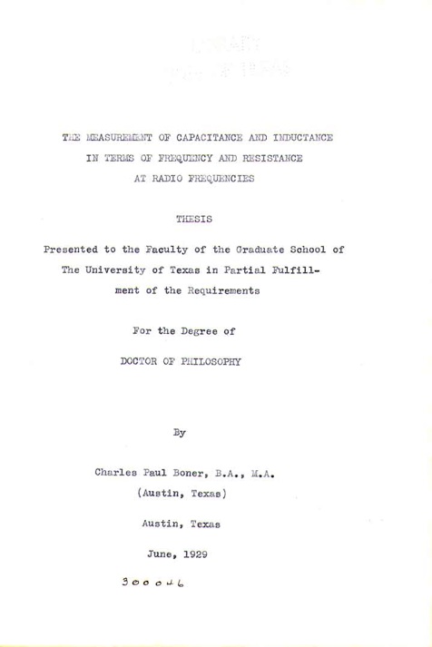 Dr. C. Paul Boner was born in Nocona, Texas on February 8, 1900. His parents were Charles Wilbur Boner and Sallie Lee Westmoreland Boner. He attended the Montague Grammar School, Montague, Texas and graduated from the Bellevue High School, Bellevue, Texas in 1916. His education at the University of Texas was interrupted by service in the U.S. Army in 1918. After the completion of this service he returned to the University of Texas and received the BA in Physics in 1920 and the MA in Physics in 1922. During the academic year 1927-28 he was a Whiting Fellow at Harvard University. (Harold Whiting (1855-1895) was youngest member of Harvard Physics Department in1884, was said to have an agility of mind and inventiveness approaching genius. He and his whole family perished in a shipwrecck in 1895. In accord with his Will the Whiting Fellowships were established thave been supporting graduate students ever since. Other UT students receiving this fellowship were Conrad Shuddemagan, S. Leroy Brown, Charles P. Boner.) He returned to the University of Texas and received a PhD in physics in 1929.