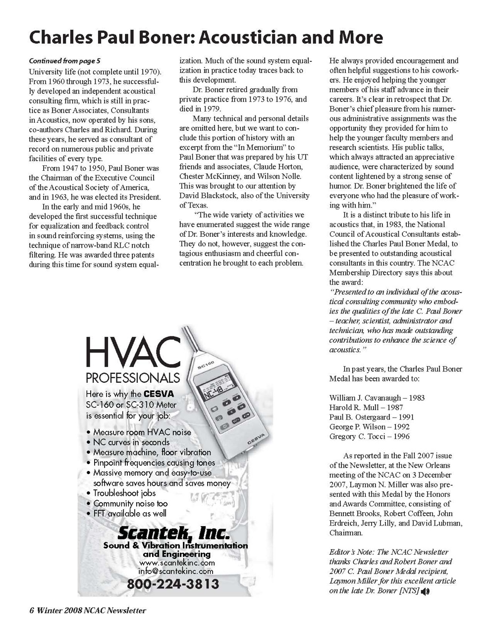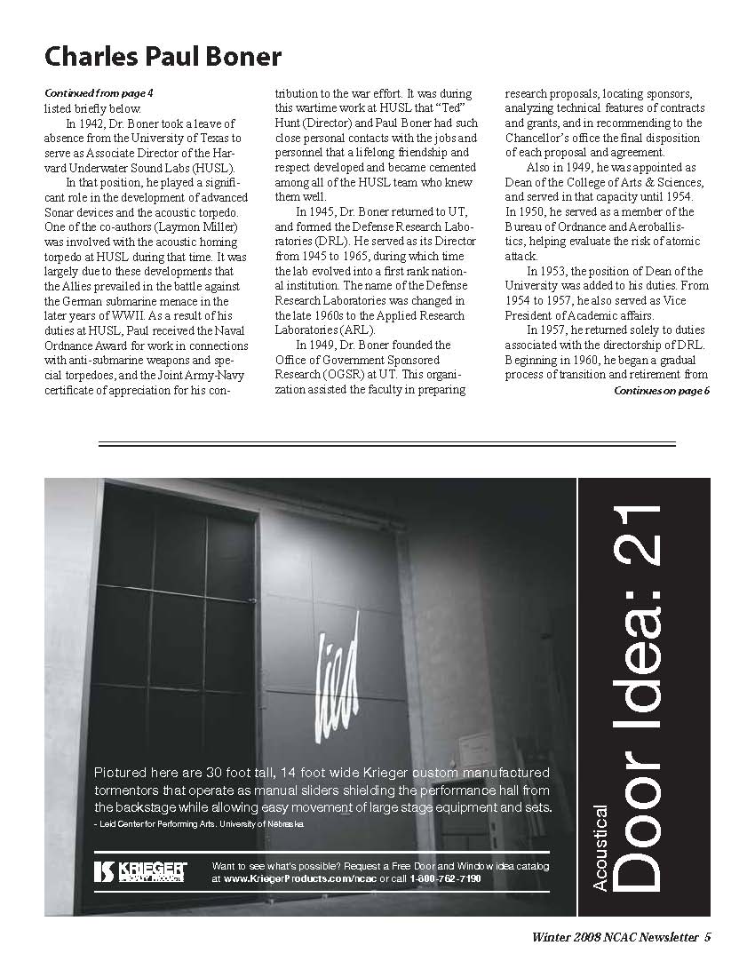 Professor Boner article in National Council of Acoustical Consultants, Winter 2008, page 3 |