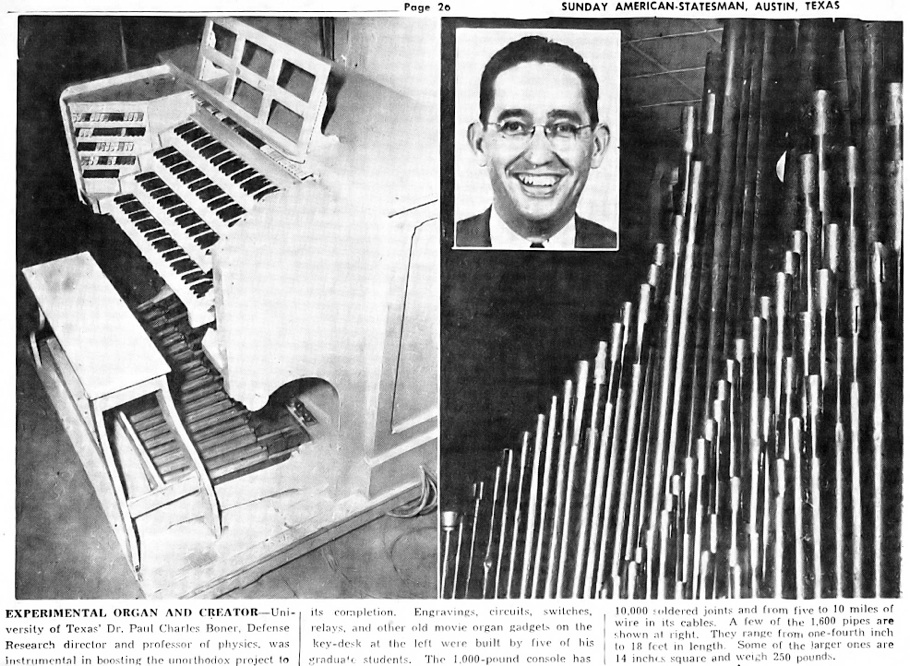 An offer in a classified advertising section of a newspaper told of a pipe organ in Midland selling for the price of the pipes needed by the physicist. The organ was purchased and moved to Austin, blower and all. The small-action console was set up, and Dr. Boner & Company started research.