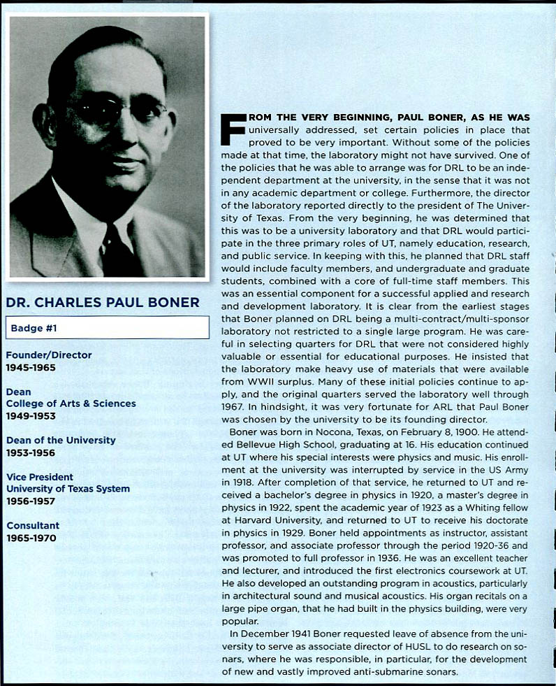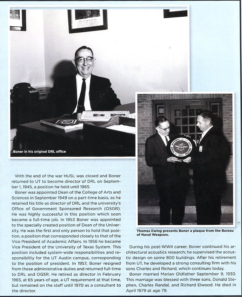 In 1945, Dr. Boner returned to the University of Texas, and formed the Defense Research Laboratories. He served as director of DRL from 1945 to 1965, during which time the lab evolved into a first-rank national institution. The name of the Defense Research Laboratories changed its name in the late 1960's to the Applied Research Laboratories.