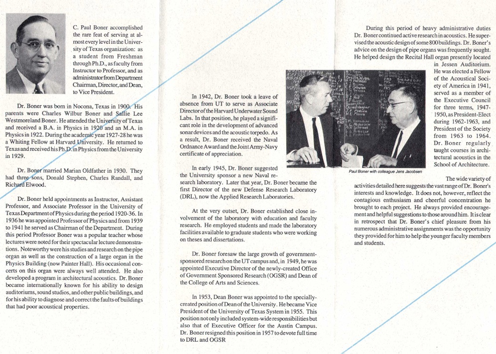 Dr. Boner held appointments as Instructor, Assistant Professor, and Associate Professor in the UT Department of Physics during the period 1920–1936. In 1936, he was appointed Professor of Physics. During this period Professor Boner was a popular teacher whose lectures were noted for their spectacular lecture demonstrations. He initiated the first courses in electronics at the University and began a program of research in acoustics that had far-reaching consequences. Noteworthy were his studies and research on the pipe organ. This involved not only research into the physics of organ pipes but also the construction of a large organ which was located in the Physics Building (now Painter Hall). His occasional concerts on this organ were always well-attended. He also developed a program in architectural acoustics; a program in which he and his students developed professional skills that will be mentioned below. Dr. Boner became known internationally for his ability to design auditoria, sound studios, and other public buildings and for his ability to diagnose and correct the faults of buildings that had poor acoustic properties.