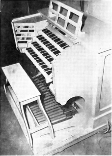All three organs were then combined. And a console was built in 1935 by Will Hofmann and his father, University cabinet workers. The console or key desk weighs 1,000 pounds and rests on wheels. Engravings, circuits, relays, switches and other gadgets it employs were built by the graduate students.