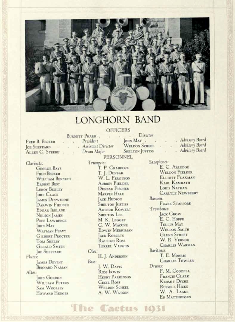 University of Texas Longhorn Band, 1931 Cactus,maybe fourth from left on front row. |