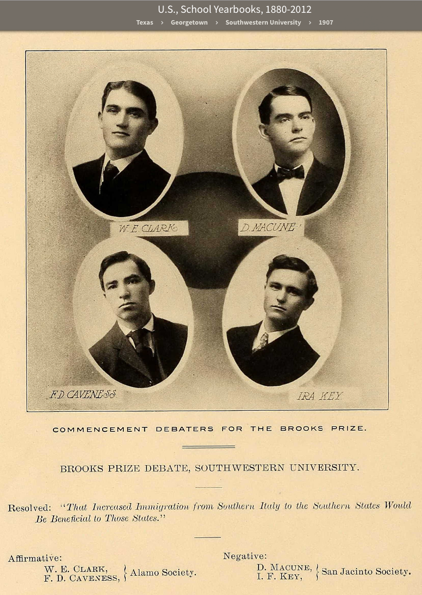 Dennis Macune, debater, Southwestern University yearbook, Sou’wester, 1907. |