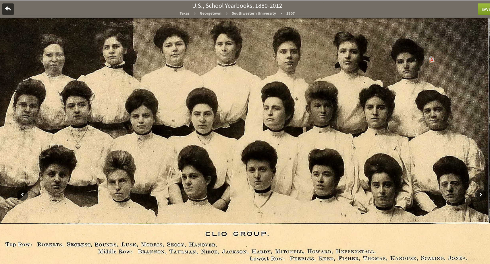 Lena Secrest Macune, Southwestern University yearbook, Sou’wester,, 1907, Clio Society |