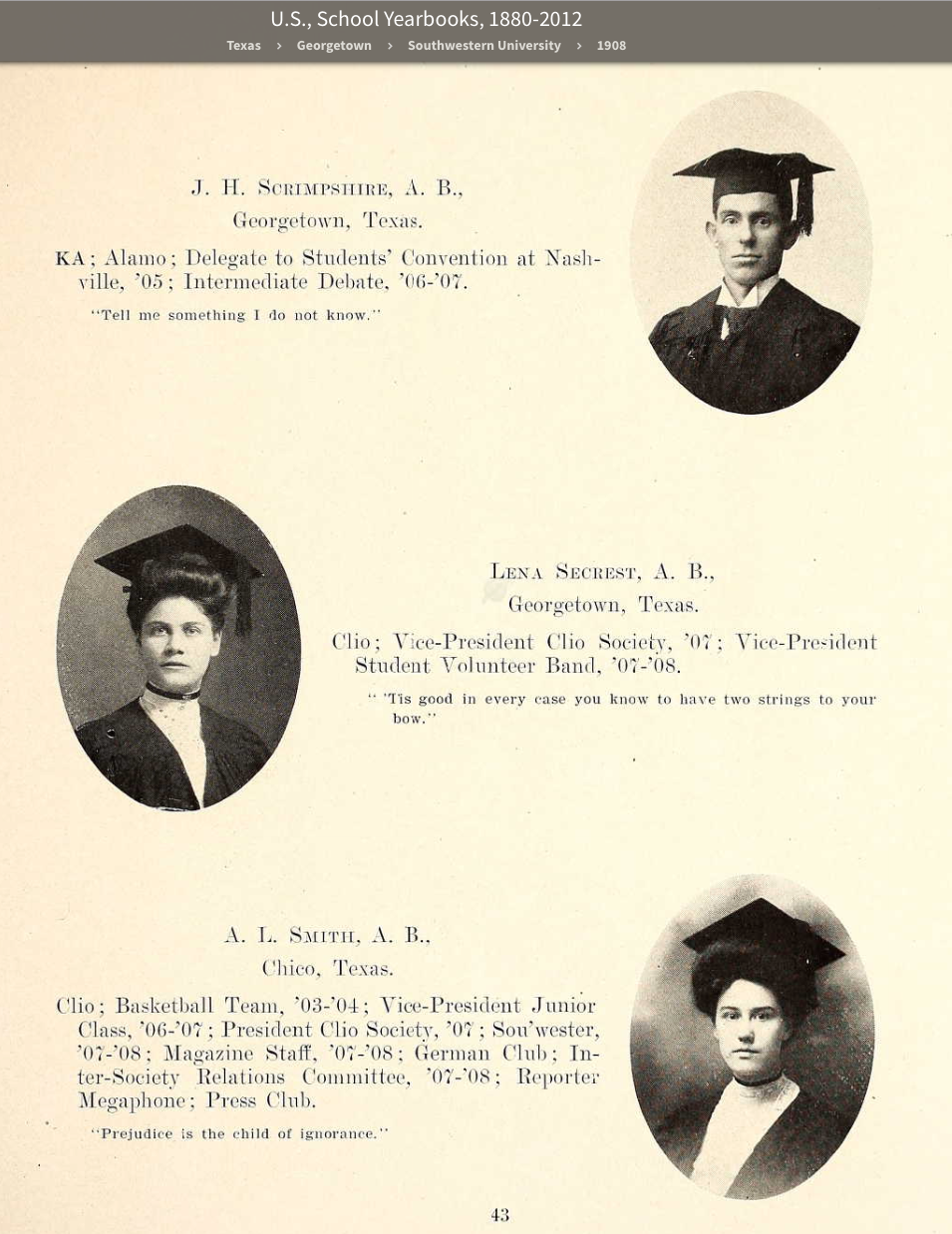 Lena Serest, Graduate of Southwestern University yearbook, Sou’wester, in Georgetown, Texas, 1908 |