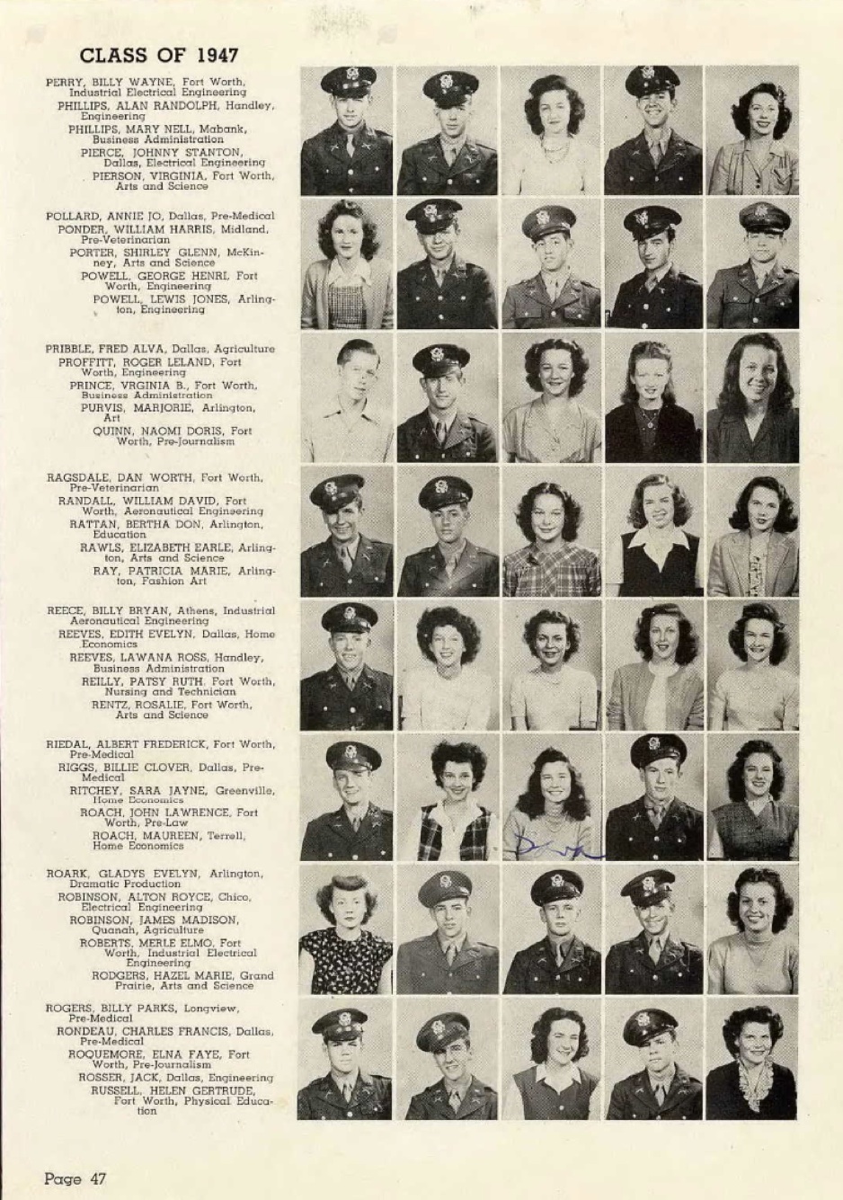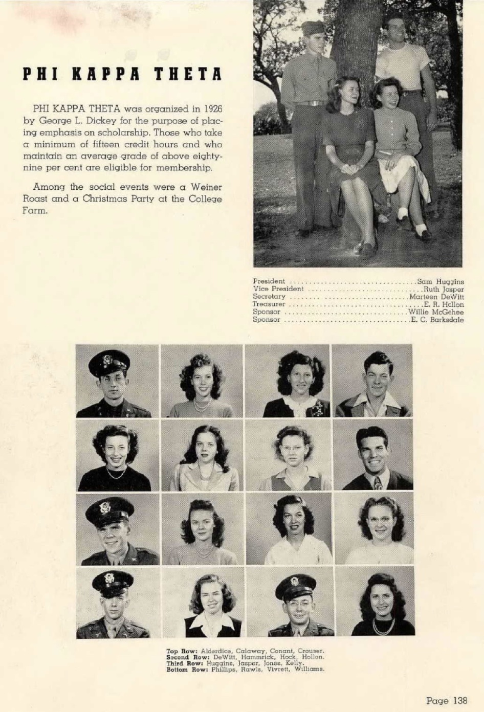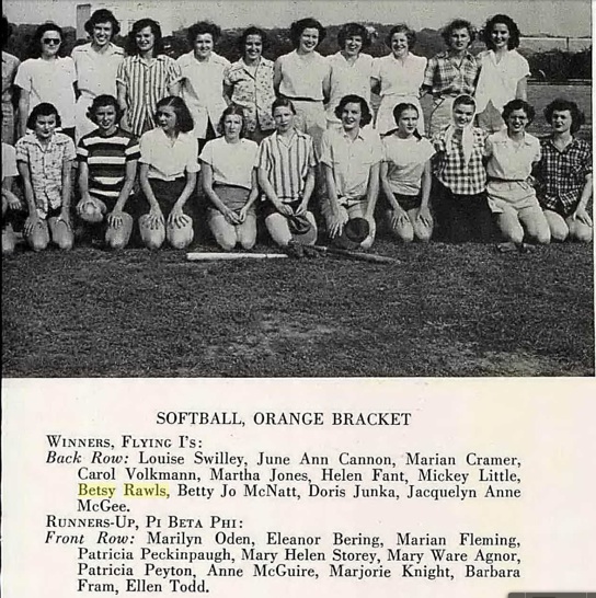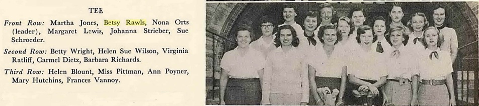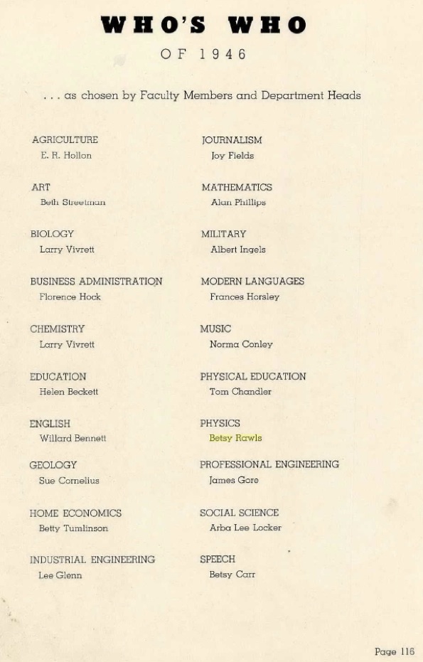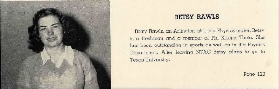 Betsy attended Lovelady High School in Lovelady, Texas. Betsy enrolled in North Texas Agricultural College in Arlington, Texas in 1946 as a physics major, and though a freshman, she was recognized in the yearbook for her athletic ability and her academic achievements. The following entry from the yearbook was a result of her selection by faculty members and department heads for the title “Who’s Who” in Physics. She was also selected for Phi Kappa Theta, an honor society which required a minimum of 15 hours each semester and a grade average above 89%.