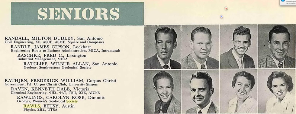 Acknowledgement: Thanks to Betsy Rawls for some of her recollections about her UT years and career.