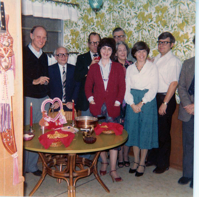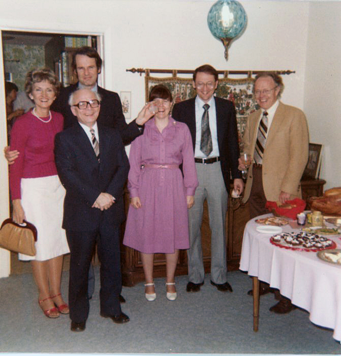 Hans Schlüter visited UT in Feb. 1981. A party in his honor was held at Pat and Mel Oakes' home. L to R: Mel Oakes, Hans Schlüter, Tom Griffy, Penny Griffy, Wilson Nolle, Peggy Nolle, Susan Antoniewiz, Pete Antoniewics. |