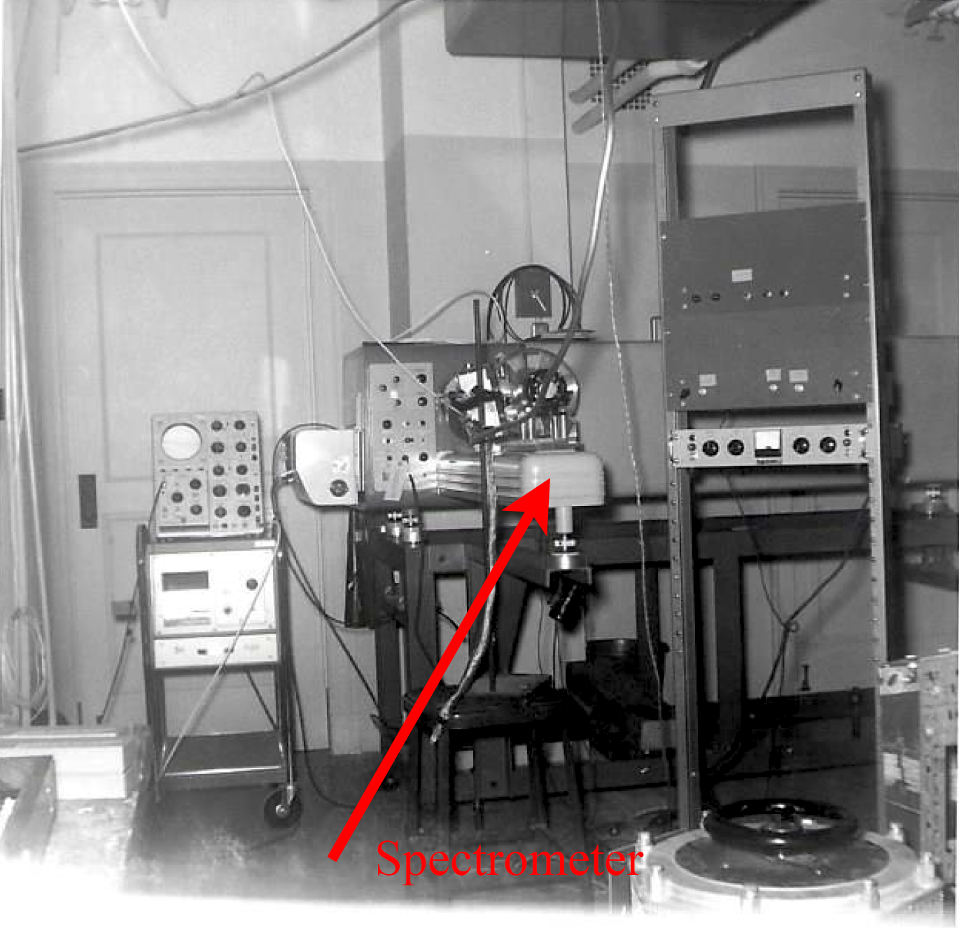 At left is the radio frequency (30 Mhz) discharge in a magnetic bottle consisting of two solenoids. A bright light ellipsoidal region with high eletron density, 1013 cm-3, appeared at one of the high field regions of the bottle. This made for a highly desireable light source for studying the collisional "Stark" broadening of the spectral lines of hydrogen and helium. At right is the Bausch and Lomb grating (180,000 lines) stigmatic spectrometer used for these studies. The equipment was used by Schlüter, Carlos Avila and Jim Durham. Avila contributed the photos. More details here.