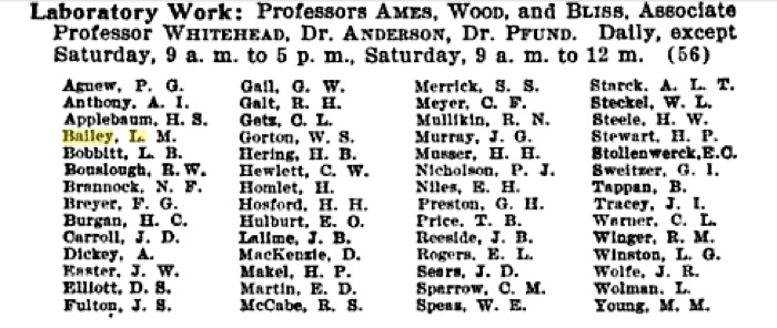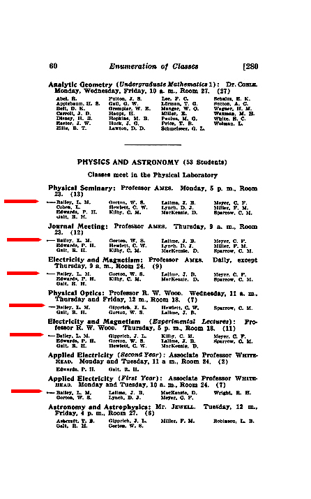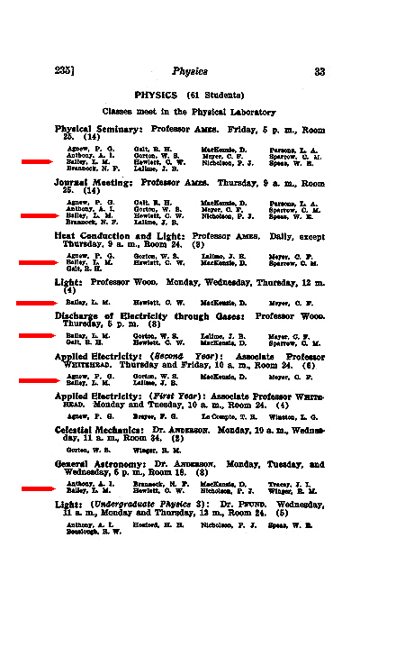 Two PDF excerpts from Johns Hopkins catalogs for 1909 and 1910, comprising the “Enumeration of Classes” for the “second half-year” (i.e., spring semester) of each of those years. The catalogs in the late 19th century published class lists for both semesters, but by this time they were only compiling such lists for one semester. You’ll see “Bailey, L. M.” listed (red arrows) under many classes in physics and astronomy, along with the names of instructors: Joseph Sweetman Ames, Robert Williams Wood, John Boswell Whitehead, August Herman Pfund, John August Anderson, and William Julian Albert Bliss.