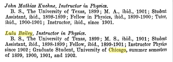 Lulu Bailey’s transcript from the University of Chicago records that she first attended there the nine weeks’ summer quarter in 1898, between her junior and senior year at Texas. She earned half a credit with a B- in Advanced Experimental Physics (m19) and another half credit in General Physics (m23) with A classwork and B on exam. She also enrolled in Plane Analytics Math (m 3?), however she was absent 4 days, has C classwork and was absent from the exam so earns no credit. In Summer 1899, she is listed as registered for Graduate. School. Her courses include Differential Calculus, 3/4 credits with grade of B, Advanced Experimental Physics, one credit, grade-passed, Physics Manipulation, one credit, grade-passed, and Electric Waves (m38), half credit, grade passed. The Annual Register of the University of Chicago shows Lulu enrolled during the summer of 1899 as an Unclassified Student. Her transcript however listed Degree Sought-PhD.