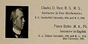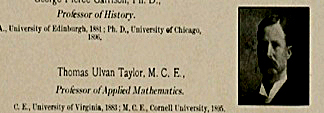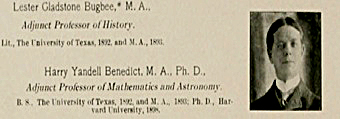 *Harry Yandell Benedict, (Professor of Applied Mathematics and Dean of Men); *Lulu Mary Bailey (Instructor of Physics); *Jessie Andrews, (Instructor in German and First UT Woman Graduate (1886); *Helen M. Kirby, (Dean of Women); Lelia May Casis, (Professor of Romance Language and First Woman to achieve Full Professorship); William James Battle, (President and Professor of Greek); Thomas Ulvan Taylor, (Professor of Civil Engineering)
