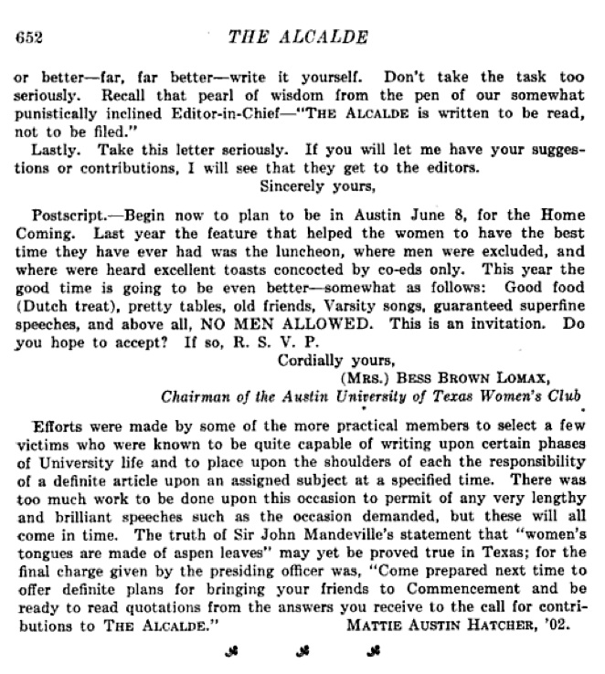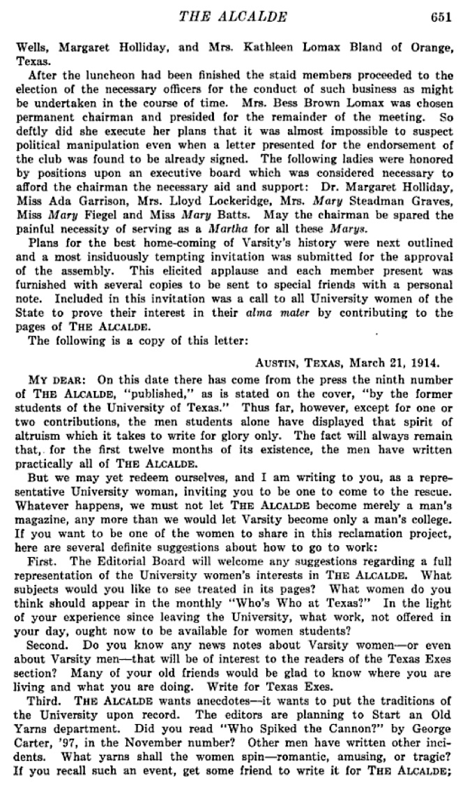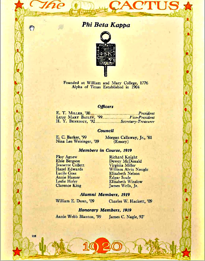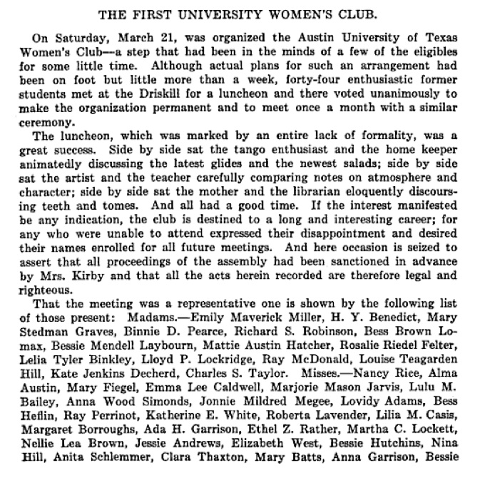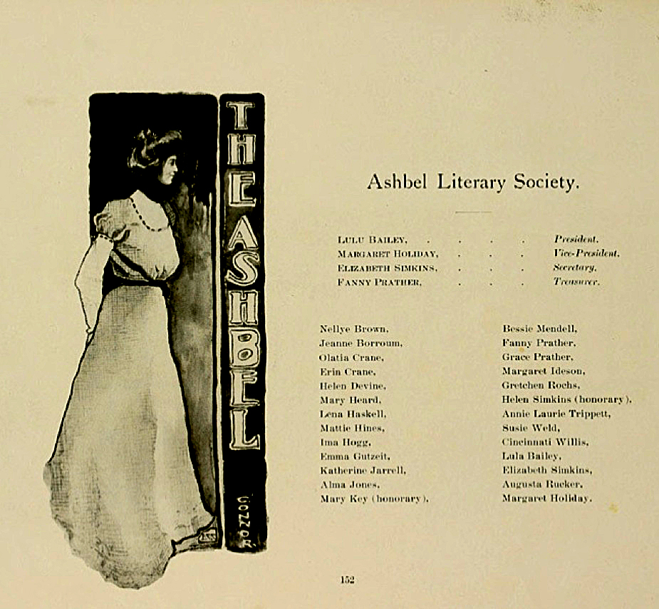 In 1898, Lulu appeared in the University of Texas yearbook, the Cactus. She is one of 11 girls in a class of 29 students and a member of the Ashbel Smith Literary Society, a membership she maintained for the rest of her life. Her obituary says she served as president of the society. The society, formed in 1889, gave women an opportunity to debate, perform dramas, and host musical and literary performances. It was named for the first president of the Board of Regents. (Smith was eventually dropped from the society’s name.) She is also listed as a student assistant in physics for 1897–1998. Others listed are John Mathias Kuehne and Charles Philip Norby. Lulu served as editor of Magazine, 1894–1995 and also was selected as president of her Graduate Class in 1899–1900.