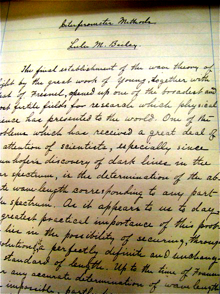 In the course of my effort to provide a complete picture of Lulu Bailey, a happy conclusion emerged. She is likely one of the earliest, if not the first, woman physicist in Texas, maybe even in the Southwest. Despite the absence, as yet, of a publication, other than her master’s thesis, her scientific curiosity led her to several of the centers of physics research of that period, the U. of Chicago and Johns Hopkins. Presumably she took what she learned back to Texas and shared it with her colleagues and students, expanding their horizons and their goals. Elizabeth Reames earned a PhD in physics at Tulane in 1913. She was an Instructor-Assistant Professor at Tulane until 1954. Her research was however in botany.—Mel Oakes