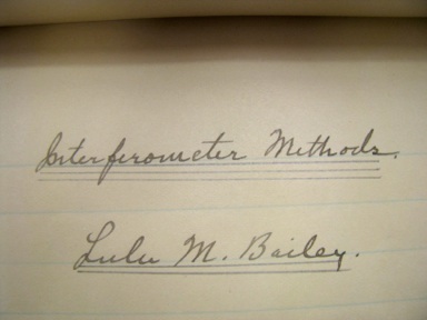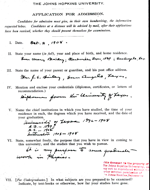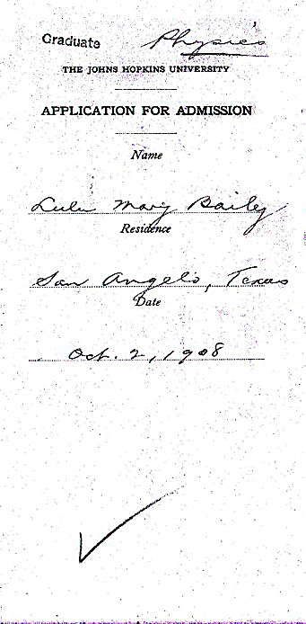 In the spring of 1908, the Regents approved a leave of absence for Lulu to attend Johns Hopkins University. Johns Hopkins has a student file on Lulu M. Bailey, but it consists only of a single-page application form. Admission to Hopkins in their early years—especially for graduate students—was a brief, informal process. She applied for admission on October 2, 1908. She gave her full name as Lulu Mary Bailey, born in Clarksville, Texas, in 1869, and was then living in San Angelo. Under parent/guardian, she listed her mother, Mrs. J. S. Bailey, of San Angelo, Texas. For her educational credentials, she indicated “diplomas from the University of Texas.” She then itemized her affiliation with the University of Texas, listing her degrees and that she was an Instructor, 1901–1908. The only other information on this form is a sentence where she was asked to state her intention in coming to Hopkins. She wrote, “It is my purpose to [take] some graduate work in physics.” Thus, she gave no indication that she intended to pursue a Hopkins degree. Two documents obtained from Johns Hopkins show her classes.