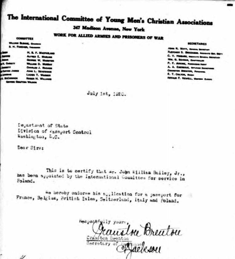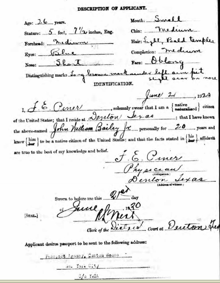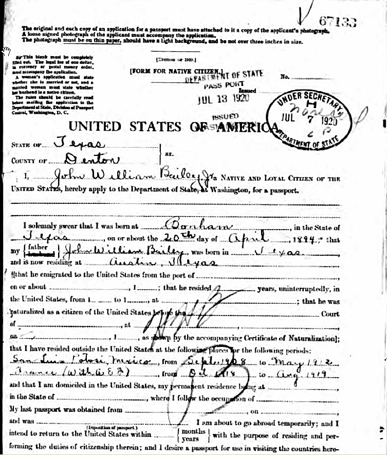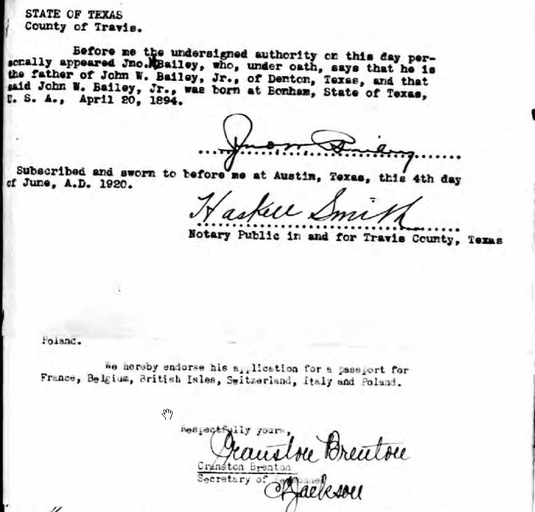 Bailey, John William, Jr. (b. April 20, 1894) — also known as John W. Bailey, Jr. — Born in Bonham, Fannin County, Texas. In June 1917, he was a student who was employed at a federal government training camp. He served in the U.S. Army during World War I. From Oct 1918 to Aug 1919 and Aug 1920 to Feb 1921 he was in Europe serving A.F. In March of 1921, he received a passport to spend two years in Mexico on commercial business. He departed from Laredo. His current residence was Austin where he was a rancher. His father was in Austin also. His other assignments include: U.S. Vice Consul in Geneva, 1924-26; Lausanne, 1925; Loanda, 1926–1929; Prague, 1929; U.S. Consul in Prague, 1929–1932. In 1925, he was at the Deptartment of State in Washington, DC. There is no indication that he married. |