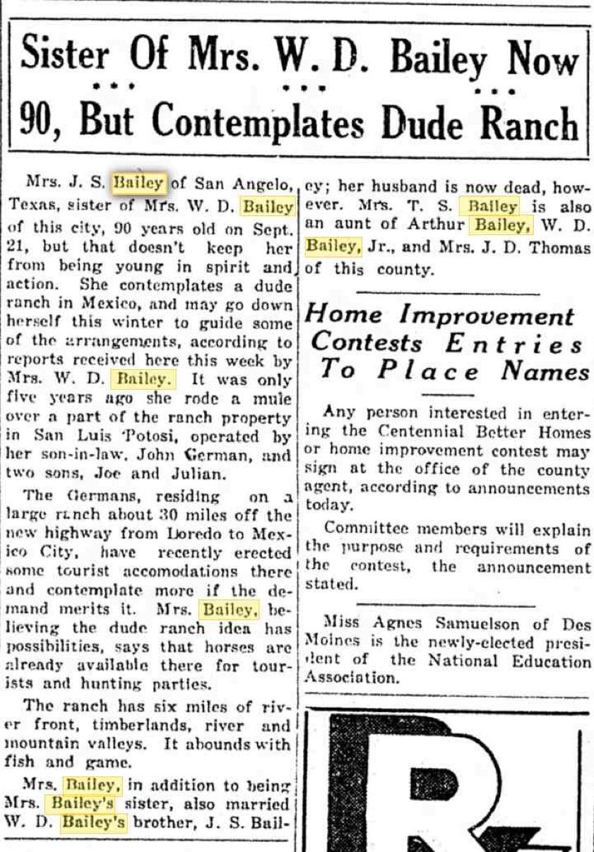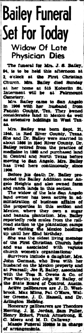 In 1880, Joseph retired from the practice of medicine and purchased land in Central and North Texas before moving to San Angelo, TX. Before his death in 1907, Dr. Bailey promoted the Bailey Addition near Angelo Heights in San Angelo. Joseph died in 1907. Julia assumed control of their business properties which also included a sugar and banana plantation in Mexico. Mrs. Bailey reportedly rode mules from the railroad station to the plantation camps while visiting her Mexico holdings up until her 82nd birthday. Her daughter Bonnie married John Zacheus German (b. Feb. 3, 1872-–d. Jan. 26,1948 in Frio, TX), and they lived on and operated the plantation in Mexico. Julia Bailey lived to age 94, dying June 18, 1939, at her home, 515 Koberlin, San Angelo, TX. She and her husband are buried in Fairmont Cemetery in San Angelo. Informant on death certificate was Joe F. Bailey, son, Ft. Worth, TX (d. July 20, 1961)(wife Janie D. Bailey). Julia’s strong will, resourcefulness and independence and Joseph’s scientific interest were traits inherited by their remarkable daughter Lulu Mary Bailey.