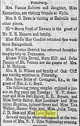 In 1892, Lulu was quite the social butterfly. In January, the Dallas Morning News reported that she and her sister, Dora, visited Mrs. Albert Erwin in Leonard. In the June 27, 1892 issue of the News, the social column, Kaleidoscope of Society, under the Pittsburg section, reported couples enjoying a picnic on flag pond, included were J. D. Bass and Miss Lulu Bailey. In the September 4, 1893, issue of the Dallas Morning News, the Bonham section of the Social Column lists Miss Lulu Bailey as having gone to Honey Grove. The J. D. Bass was Jefferson Dozier Bass, a lawyer and a prominent member of the Pittsburg, Camp, TX community. He became a judge and served twice in the Texas Legislature. He is pictured at left.