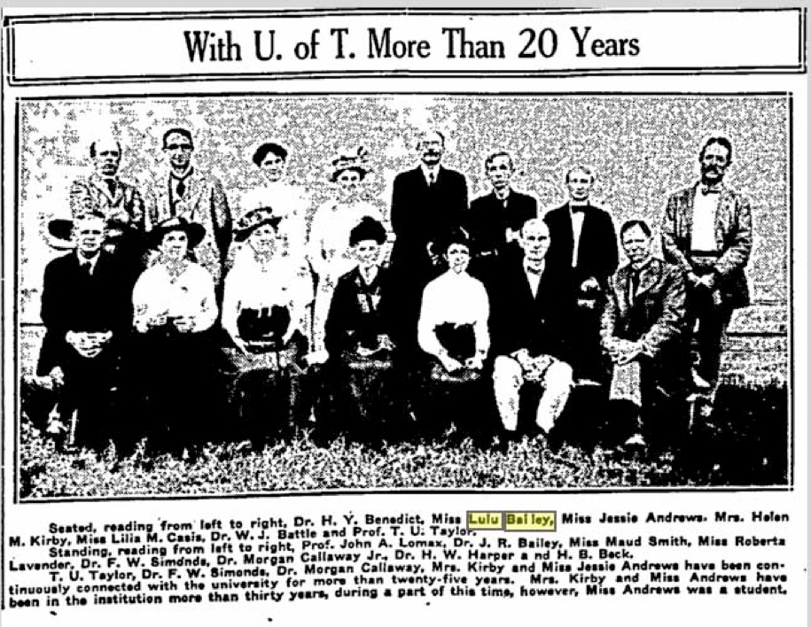 On November 5, 1916, the Fort Worth Star Telegram ran a picture noting UT faculty having served 20 or more years. The picture is below. Lulu Bailey is seated second from the left, on the front row. Original version of photo is shown below newspaper version