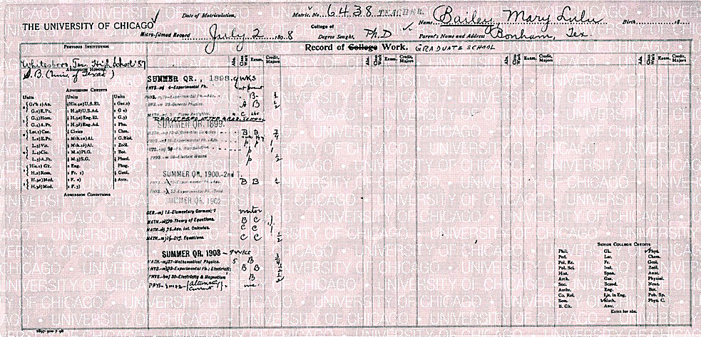 In 1902, she returned to Chicago for the second summer term following her master's degree at Texas in 1901. She earned half a credit in Advanced Experimental Physics with grade of B. She signed up for Graduate Experimental Physics but either did not attend or failed to complete the course since no grade was recorded. In the summer of 1902, she was a visitor in an elementary German class, earns one credit in Theory of Equations, classwork-B, exam-C, one credit in Advanced Integral Calculus with grade of C and half a credit in Differential Equations with grade of C. Her final summer at Chicago occured in 1903 when she earns 3/4 of a credit, in Mathematical Physics (5 absences), 1/2 credit in Experimental Physics-Electricity and 1/2 credit in Electricity and Magnetism, all with grade of B. She is registered for Alternating Currents but does not complete the course.