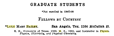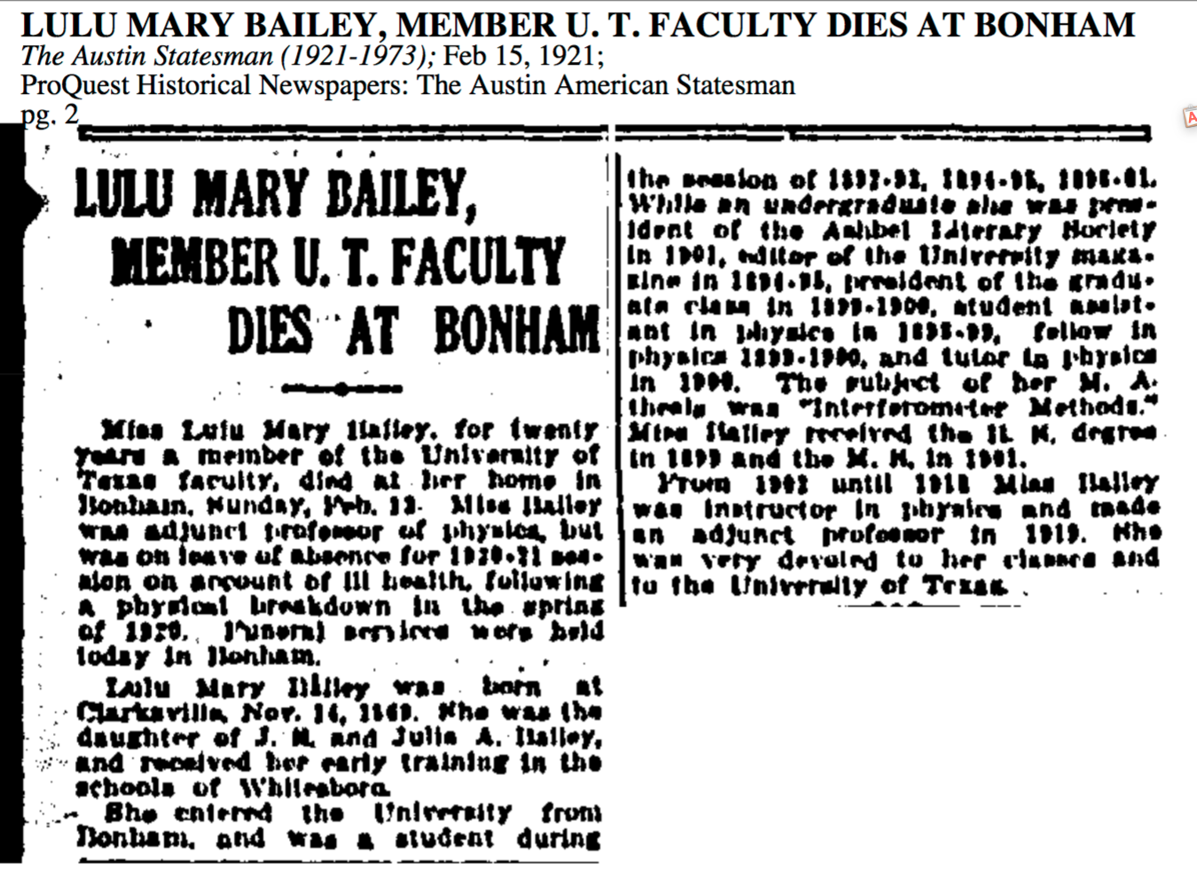 “Miss Lulu M. Bailey, for many years connected with the department of physics, University of Texas, who died at her sister's home in Bonham Sunday, was buried there Monday. Her brother, Joe F. Bailey of Arlington Heights, attended the funeral.”