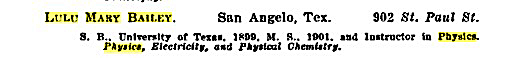 Miss Lulu Mary Bailey, for twenty years a member of the University of Texas faculty, died at her home in Bonham, Monday, Feb. 13 [1921]. Miss Bailey was adjunct professor of physics, but was on leave of absence for 1920-21 session on account of ill health, following a physical breakdown in the spring of 1920. Funeral services were held today in Bonham.