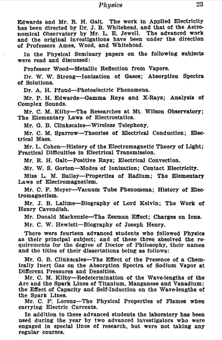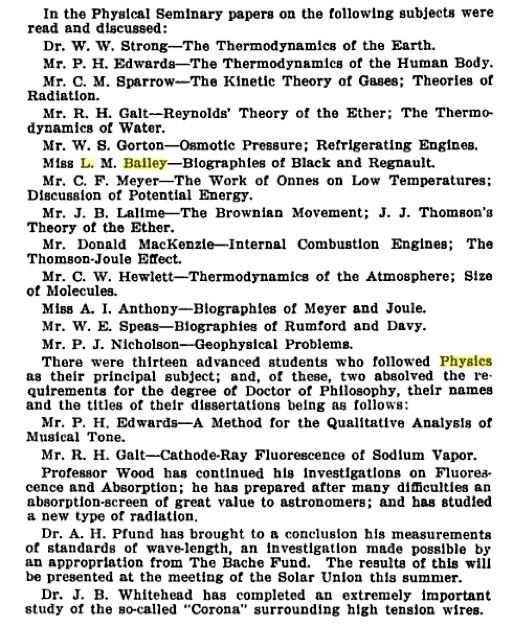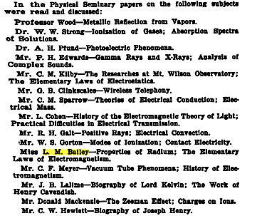 Note that Lulu Bailey and Preston H. Edwards are in this seminar. Edwards is recruited from India to teach in Physics at UT in 1921 when Lulu Bailey becomes ill. Clearly she suggested him. |
