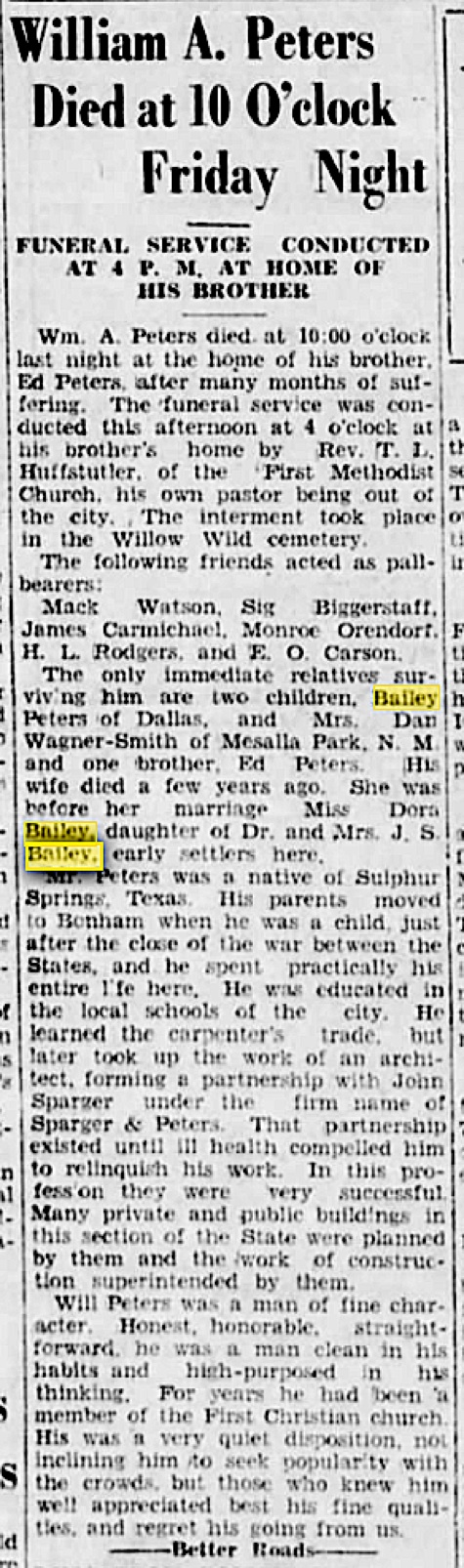 The funeral service was conducted at Mr. Peters home at 4 o’clock this afternoon by Elder F. W. O’Malley of the First Christian Church. The interment took place at the Willow Wild Cemetery.