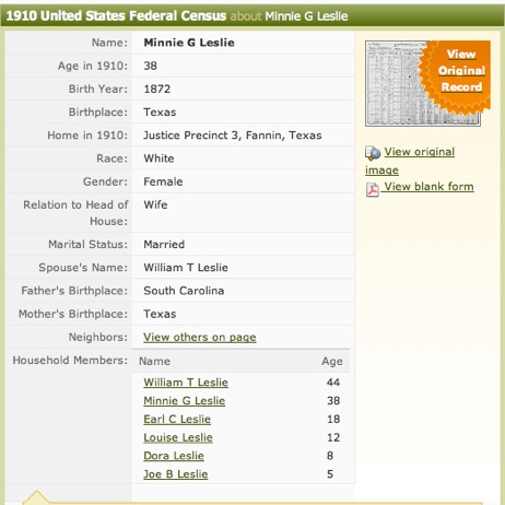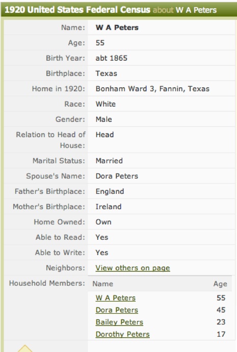 1900 Census Records: Denton Ward 4, Denton, TX. Father: Joseph S. Bailey (age 65, b. S. Carolina or TN), Farmer, Mother Julia Bailey (age 54, b. Sept 1845, TX.), brother John W. (married, no wife listed, b. June 1867), Mary L. (b. Nov. 1869–), and Bonnie (b. June 1876, married to J. B. German, age 28), Joe F. (19, b. 1880). The children say their father was born in Tennessee, but he says South Carolina.