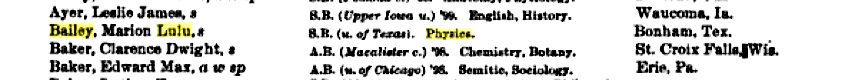 She entered the University from Bonham, and was a student during the session of 1892-93, 1894-95, 1896-1901. While an undergraduate she was president of the Ashbel Literary Society in 1901, editor of the University magazine in 1894-1895, student assistant in physics in 1898-99, fellow in physics 1899-1900, and tutor in physics in 1900. The subject of her M. A. Thesis was “Interferometer Methods.” Miss Bailey received the B. A. Degree in 1899 and the M.A. in 1901.