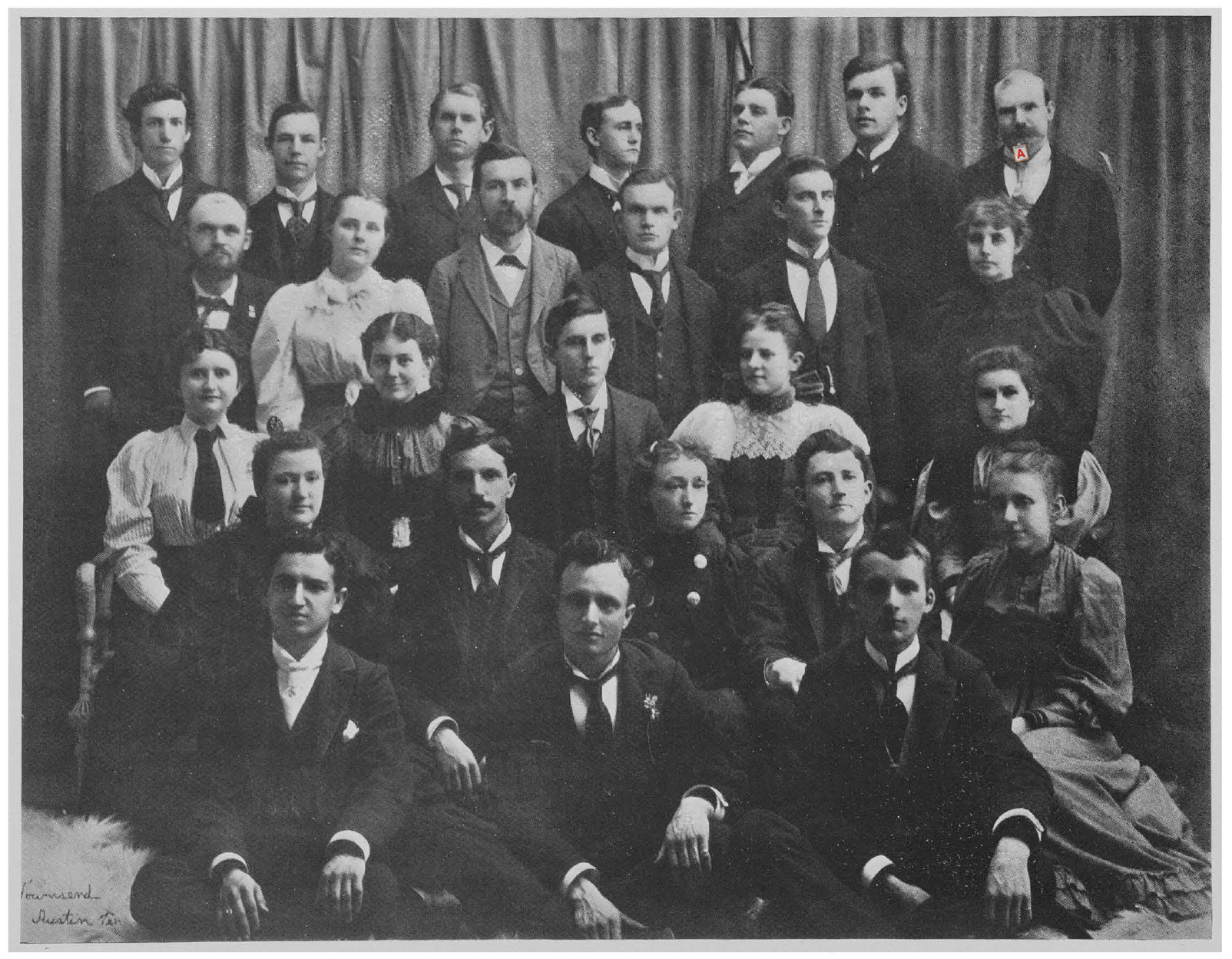 While Lulu Bailey is listed as a member of the Class of 1896 in this Cactus yearbook and not with the list of 1895 class, it is extremely likely she is on the left end of the second row from the front. Evidence for this: There are eight women listed in the class, but there are nine women in this picture. Lulu got her degree in 1899, rather that 1896, she withdrew sometime between 1894-95 for unknown reason. Finally the woman looks very much like the Lulu Mary Bailey who appears in the other photos on this page. I believe the man to Lulu's left is Bernard Mackensen. |