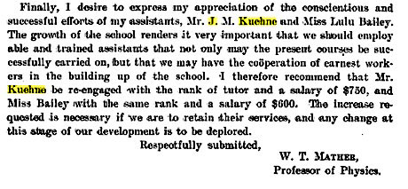 Following her graduation from UT, the Regents appointed her Assistant in Physics at a salary of $350/annum. In a 1900 report to the University President, Physics Chair W. T. Mather concluded his report with the paragraph at right.