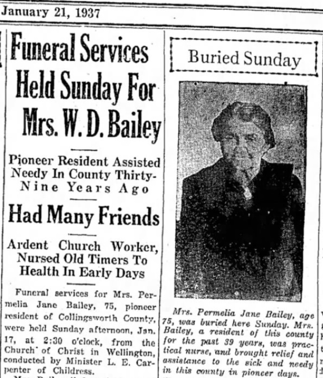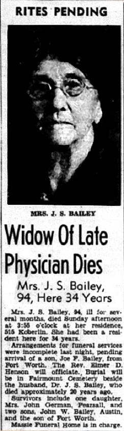 She is survived by her mother, three sisters and two brothers, beside a number of other relatives. The sisters are Mrs. William Leslie of Marble, Oklahoma, Mrs. W. A. Peters of this city, and Mrs. John German of San Angelo. The brothers are Wm. Bailey of Austin and Joe Bailey of Fort Worth.