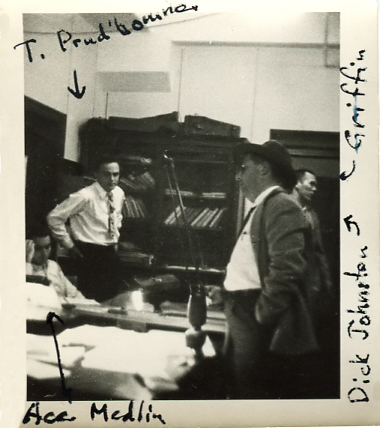 The University of Texas established the Faculty Council in 1945. Physics Department member, Malcolm Y. Colby was among the charter members. Front Row: W. F. Gidley, C. M. Rosenquist, H. T. Parlin, T. S. Painter, M. R. Gutsch, Donald Coney, and Carroll D. Simmons Middle Section Zig-Zag: T. H. Shelby, Roger J. Williams (in vest), C. Aubrey. Smith, C. R. Granberry (handkerchief in coat pocket), Byron Short,Walter Prescott. P. Webb, J. W. Calhoun (dark suit), Roy Bedichek (in vest), Malcolm Y. Colby (in vest), W. R. Woolrich (black moustache), E. J. Mathews, Charles T. McCormick (light suit, handkerchief in coat pocket), Loren Mozley (dark eyebrows), Fredrick Duncalf (light suit), H. A. Calkins, Clarence E. Ayres (tall on end), J. G. Umstattd (dark suit) Top Row: P. M. Ferguson, A. P. Brogan, H. N. Smth, J. J. Jones, Philip Graham, and J. Neils Thompson Absent were J. Alton Burdine, E. W. Doty, H. J. Ettinger. W. A. Ferguson. K.A. Fitzgerald. B. F. Pittenger and R. C. Stephenson |