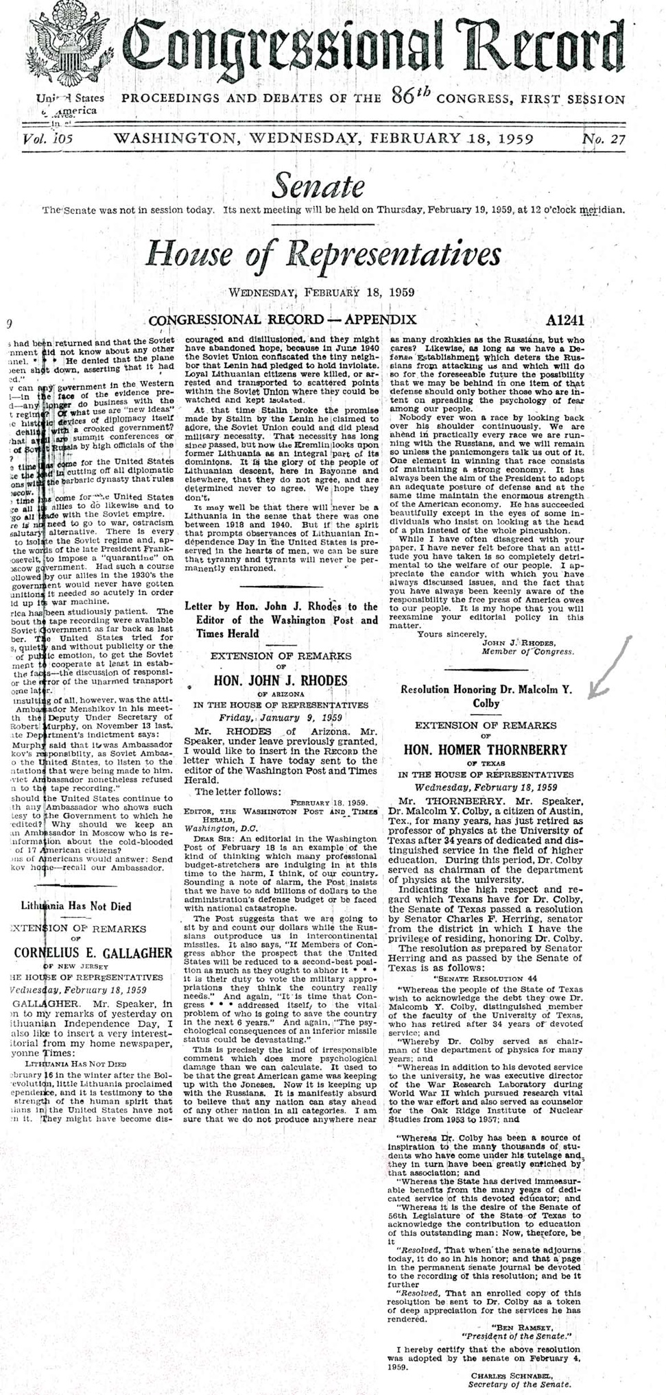 Even during his serious illnesses through the last several years of his professorship, Dr.Colby did his teaching and research magnificently. He retained his large following of students at all academic levels and he continued active in the professional journals. The record shows clearly that he was one of the outstanding members of the faculty of all times. His entire interest was in the University of Texas and his work there. No tribute such as this one can delineate his worth to the University.