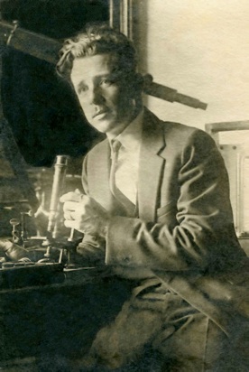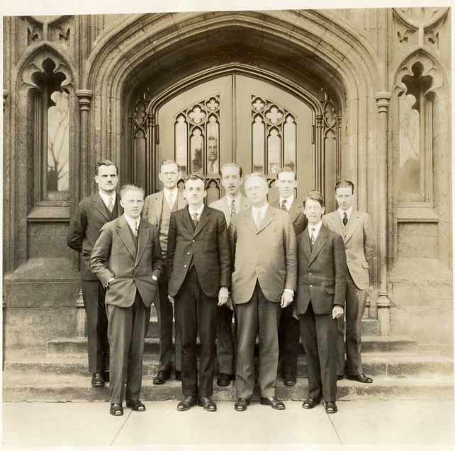 Front Row, L to R, J. A. Bearden, G. S. Monk, Frank C. Hoyt, A. J. Dempster, H. G. Gale, A. H. Compton, Harvey B. Lemon, Carl Eckhardt, J. Barton Hoag M. Y. Colby, 3rd row, second from left, in light colored suit. If this picture is from about 1928, then highly likely that another UT Professor is in the picture, namely, Darrell S. Hughes. He entered in 1928 and worked for Carl Eckhardt who is also in picture. Comparing Hughes’ undergraduate photo from U. of Kentucky, I believe Hughes to be extreme left on back row, a likely location for a new graduate student. Colby and Hughes used to reminisce together about their experiences at Chicago. |
