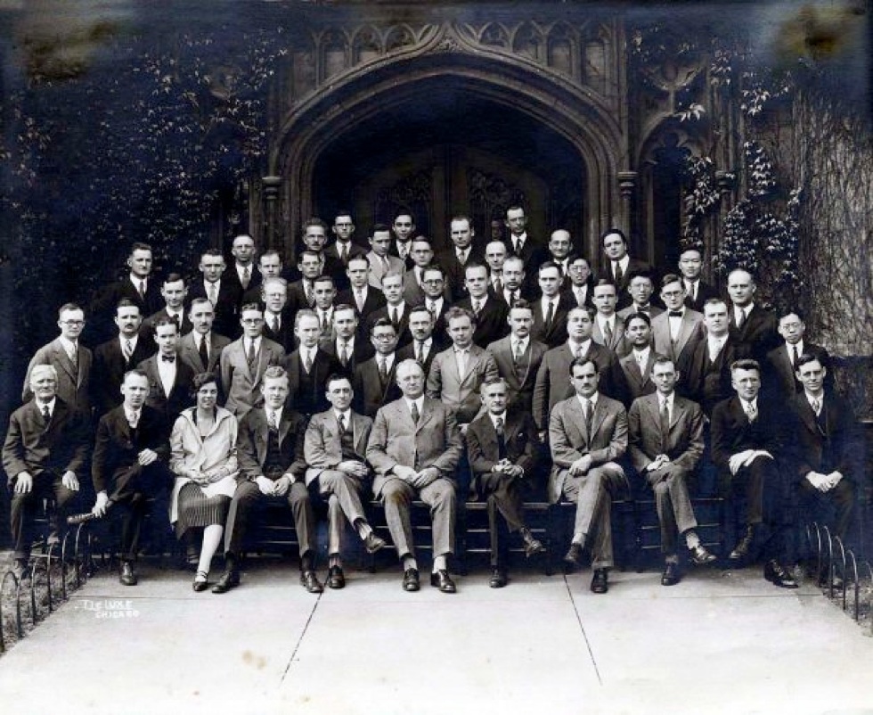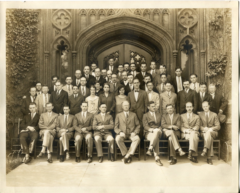 Seated (left to right): Broberg, O'Donnell, Mrs. Kimmel, W.W. Watson, A .J. Dempster, H. G. Gale, A. A. Michelson, A. H. Compton, G. S. Monk, P. Morse, F. Pearson Row 2: C. S. Barrett, J. S. Thompson, Larsen, E. O. Wollan, McDorman, F. M. Durbin, P. J. Ovrebo, Y. M. Hsieh, R. B. Kennard, M. Mooney, R.N. Jones, Harvey, T.P. Abello, Reppert, Hsu Row 3: Dooley, J. Purdy, P. S. Delaup, J. B. Hoag, K. L. Herlet, S. Chylinski, E. S. Akeley, T. H. Osgood, Chou, T. E. Reed, H. R. Wei, Smith Row 4: K. O. Lee, J. A. Bearden, Kellei, F. C. McDonald, Clark, R. C. Doan, I. Kohlberg, Y. H. Woo Row 5: C. Stein, M. L. Pool, W. R. Frederickson, F. L. Nutting, Galajikian, P. A. Constantinides Top Row: J. Bradford, I. M. Freeman, R. G. Spencer, R. D. Rusk From M. Y. Colby's photo album |