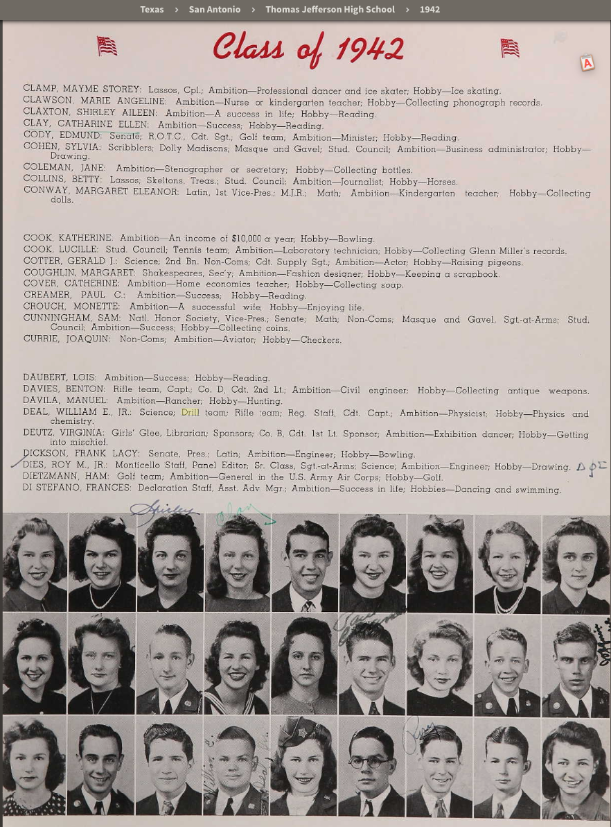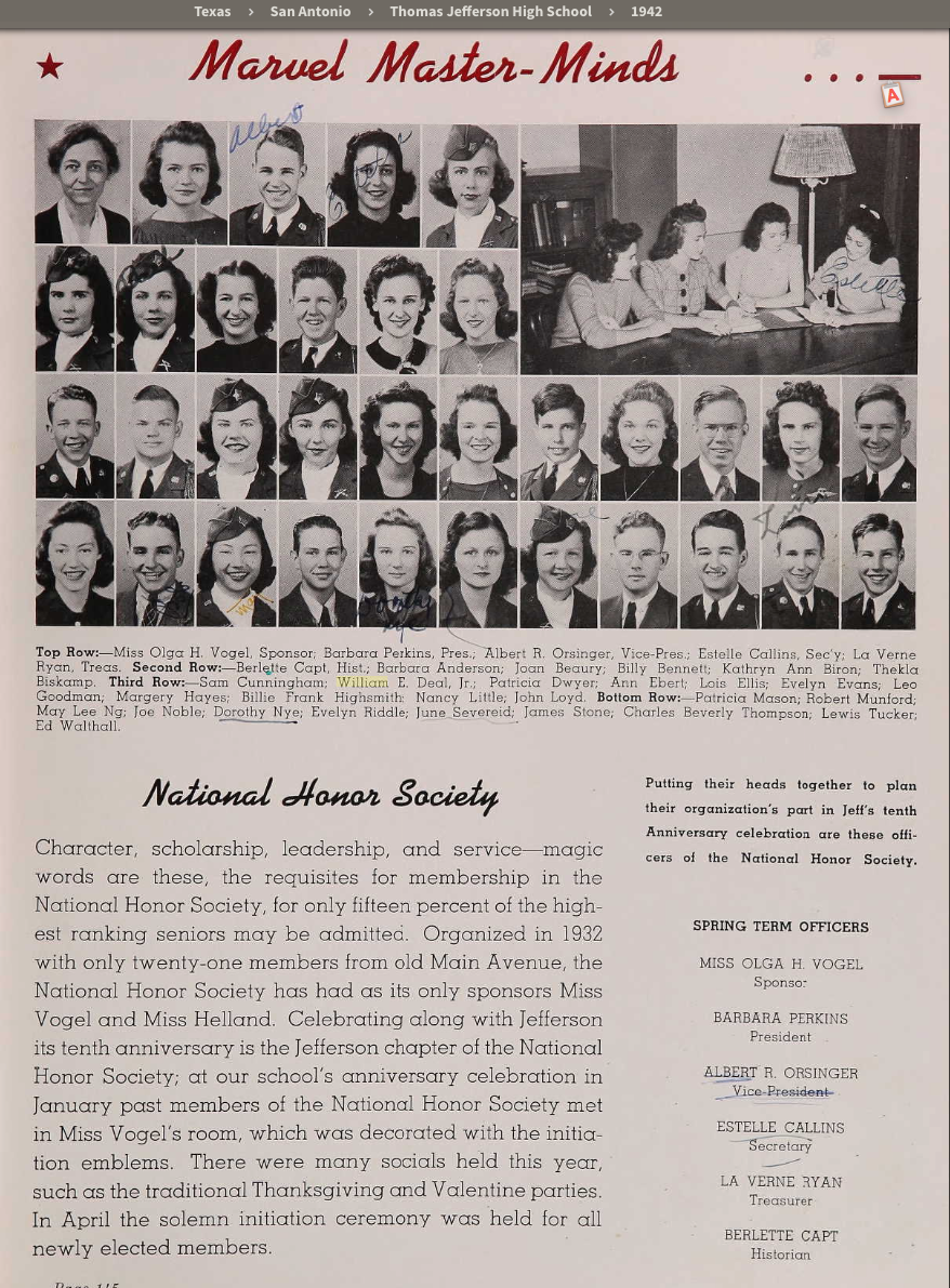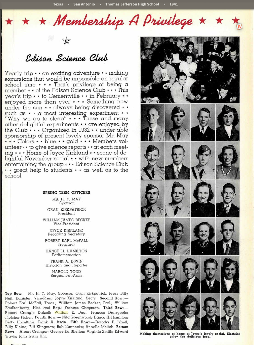 Bill Jr. graduated in 1942 from Thomas Jefferson High School in San Antonio, Texas, at the age of 17. He was a standout student and an active participant in the ROTC program. He next enrolled in the University of Texas, however, with WWII raging, he volunteered for the US Navy after his sophomore year. He was offered the opportunity to learn electronics. The Navy promoted him immediately when he went on active duty. Electronics training was done at Wright Junior College in Chicago, IL, Houston, TX and on Treasure Island in San Francisco. Following the end of the war, he volunteered for submarine duty and went to New London, Connecticut for training. He served aboard two submarines USS Trutta (SS 421) and the USS Tuna (SS 203). One cruise on the Tuna took him to Panama where he visited the home his family lived in while he was a boy. The Tuna continued on to the Pacific to provide support for the nuclear bomb test under Operation Crossroads.