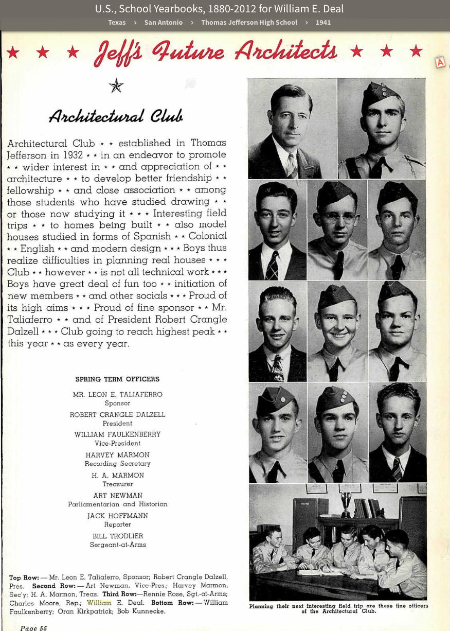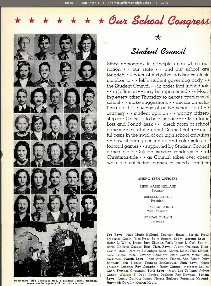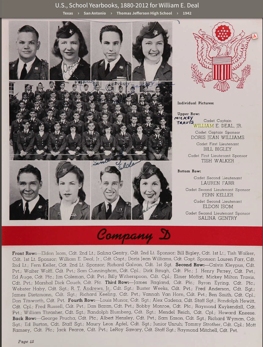 Bill Jr. graduated in 1942 from Thomas Jefferson High School in San Antonio, Texas, at the age of 17. He was a standout student and an active participant in the ROTC program. He next enrolled in the University of Texas, however, with WWII raging, he volunteered for the US Navy after his sophomore year. He was offered the opportunity to learn electronics. The Navy promoted him immediately when he went on active duty. Electronics training was done at Wright Junior College in Chicago, IL, Houston, TX and on Treasure Island in San Francisco. Following the end of the war, he volunteered for submarine duty and went to New London, Connecticut for training. He served aboard two submarines USS Trutta (SS 421) and the USS Tuna (SS 203). One cruise on the Tuna took him to Panama where he visited the home his family lived in while he was a boy. The Tuna continued on to the Pacific to provide support for the nuclear bomb test under Operation Crossroads.