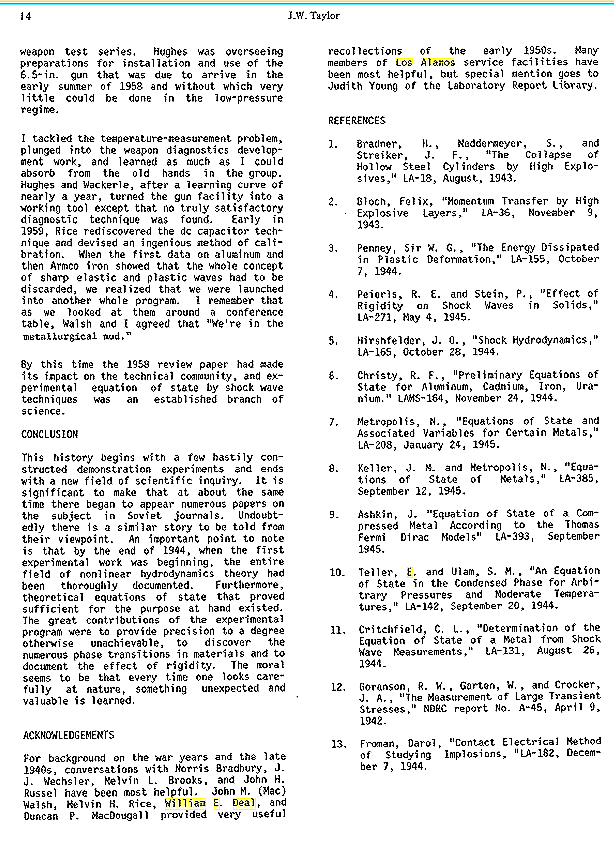 Bill and Mary, left Austin for Los Alamos, NM after he completed his oral exams in October of 1950. Both were employed by Los Alamos Scientific Laboratory. He was in the GMX-6 Division. His specialty was high density matter. Mary worked as a cyclotron operator. He was very active in the development of high speed cameras for analyzing shock waves and fast compression studies. A fellow UT graduate and good friend, Mac Walsh, went to Los Alamos about the same time. For a number of summers, Professor Darrell Hughes came to Los Alamos to work in Bill's area. In 1972, Bill became group leader of M-Division. During his career at Los Alamos, he authored many publications and reports, despite the classified nature of some of his work. John Wheeler contacted him for information to be used in his book about the Los Alamos program.