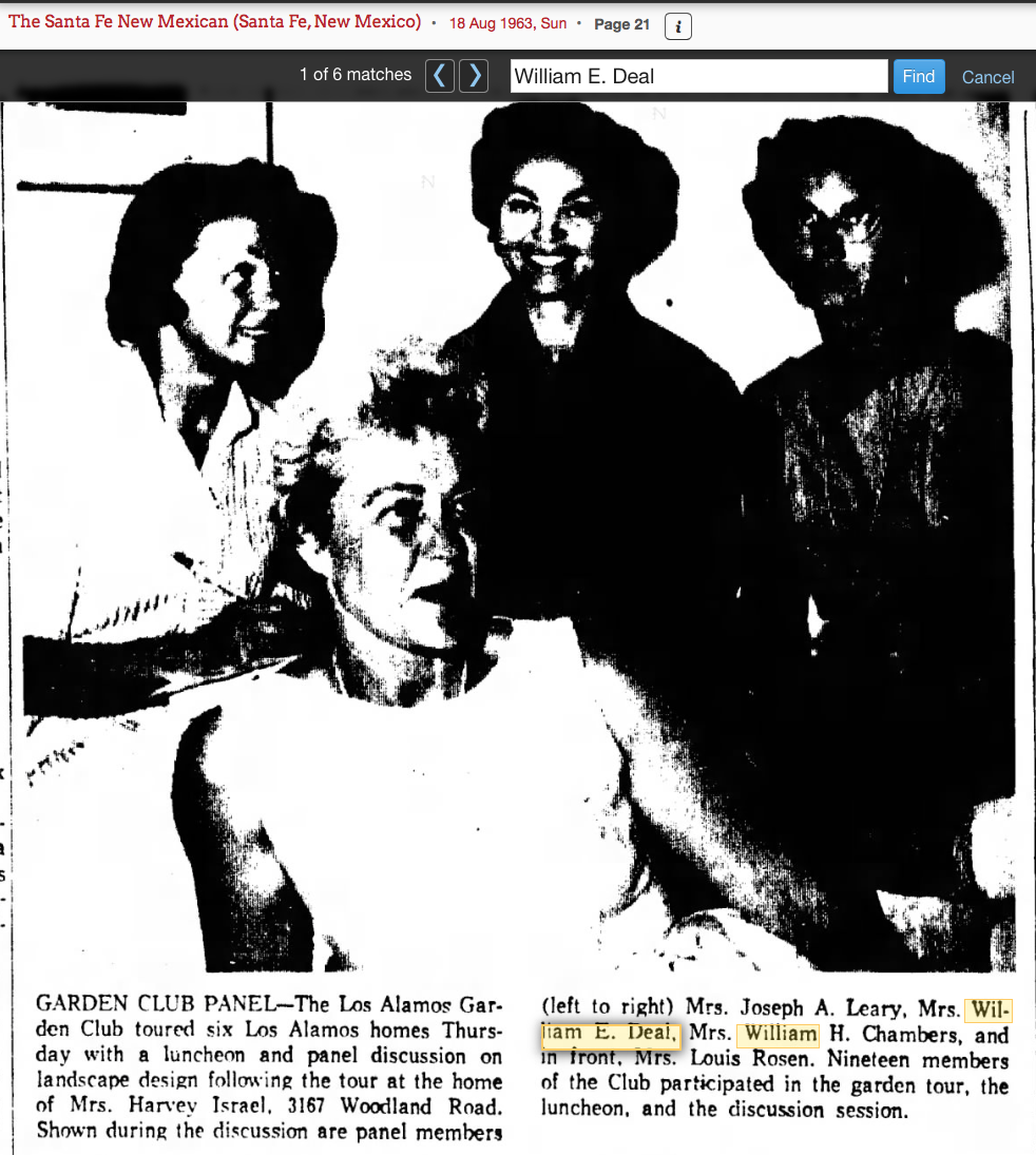 Three days after Bill Deal’s oral exams on October 13, 1950, they moved to Los Alamos, where Bill was employed at GMX-6 and Mary went to work as a Cyclotron operator for P-Division. Here in Los Alamos, Mary and Bill had their four children, Becky, Kate Lou, Mary Anne and Bill in 1953, 1955, 1957 and 1961.