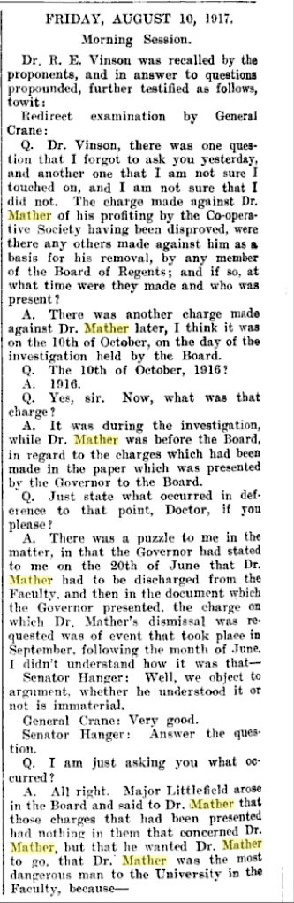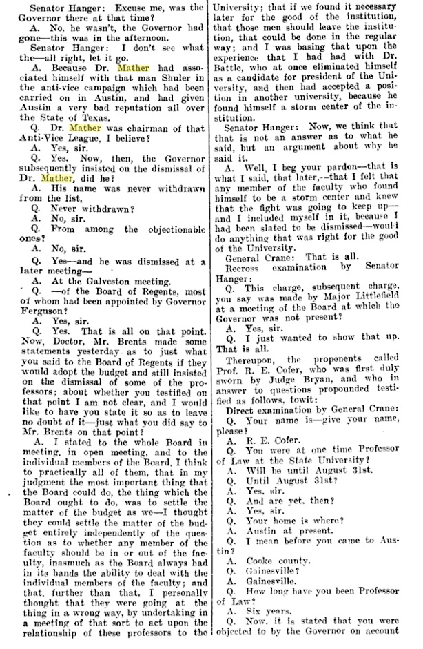 In 1917, Governor Jim Ferguson appeared before the regents to discuss his request that six faculty members be fired. His charges involved political activity, peculation and fraud. The regents fired five professors, including Professor of Physics William T. Mather. They suggested it was due to Governor Jim Ferguson’s displeasure with the five, and his threat to veto the University budget if they remained. Students and alumni protested. The Texas House of Representatives investigated charges that Mather received a percentage of the price of the laboratory manual written by him and sold by the University Co-op. He was also accused of receiving travel expenses as Chair of the University Athletic Committee. He was cleared of any wrongdoing and eventually reinstated by a non-unanimous vote of the Regents (Regent Littlefield opposed). An additional charge against Mather was his chairmanship of the Anti-Vice League in Austin, making him, according to Major Littlefield, “the most dangerous man to the University in the Faculty.” The Anti-Vice League was formed to enforce the closing of the Austin prostitution district called “Guy Town” in 1913.