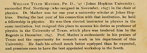 (Additions by Mel Oakes: Professor Mather in 1898 donated 140 Greek books to the University of Texas. He was chair of the Athletics Committee for UT and is credited (with another professor) with creating the Southwest Athletic Conference. He was very active in the YMCA, an important institution during the early days of UT. He worked tirelessly to push for funds for the Physics Department.)
