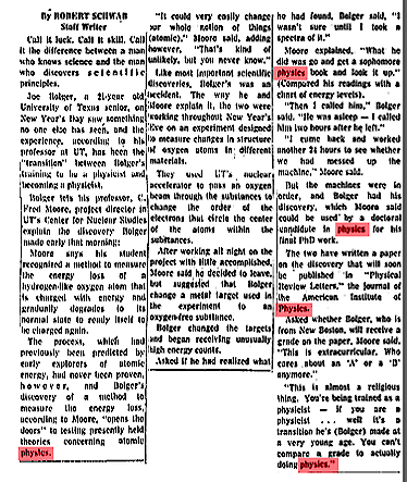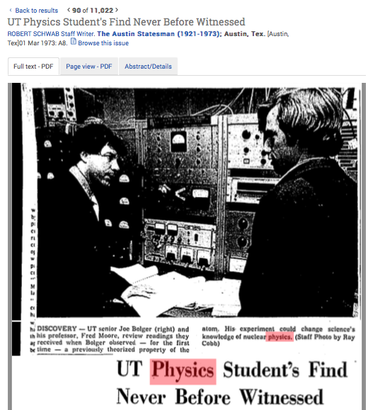 In 1965, Dr. Moore join the faculty of the University of Texas at Austin and the Center for Nuclear Studies. That year he was also made a fellow of the American Physical Society. He was a Visiting Professor at the University of Heidelberg in Germany from 1967-1968, conducting nuclear physics research at the Max Planck Institute. Over the next ten years, the Center for Nuclear Studies at Texas flourished. Most of the early research at the Center for Nuclear Studies was based on isobaric analog states. In 1970, he pioneered the study of x-ray and Auger electron transitions from highly ionized atoms. These experiments were followed up in laboratories all over the world. In 1974, he began a study of pion-nucleus interactions based on experiments carried out at Los Alamos National Laboratory. Several of the pion charge exchange reactions involved double isobaric analog states and double giant resonances (at excitation energies over 30 MeV). In 1988, Gerald Hoffmann and he became involved with the development of the STAR program at Brookhaven National Laboratory. Fred lectured at numerous universities and laboratories throughout the world.